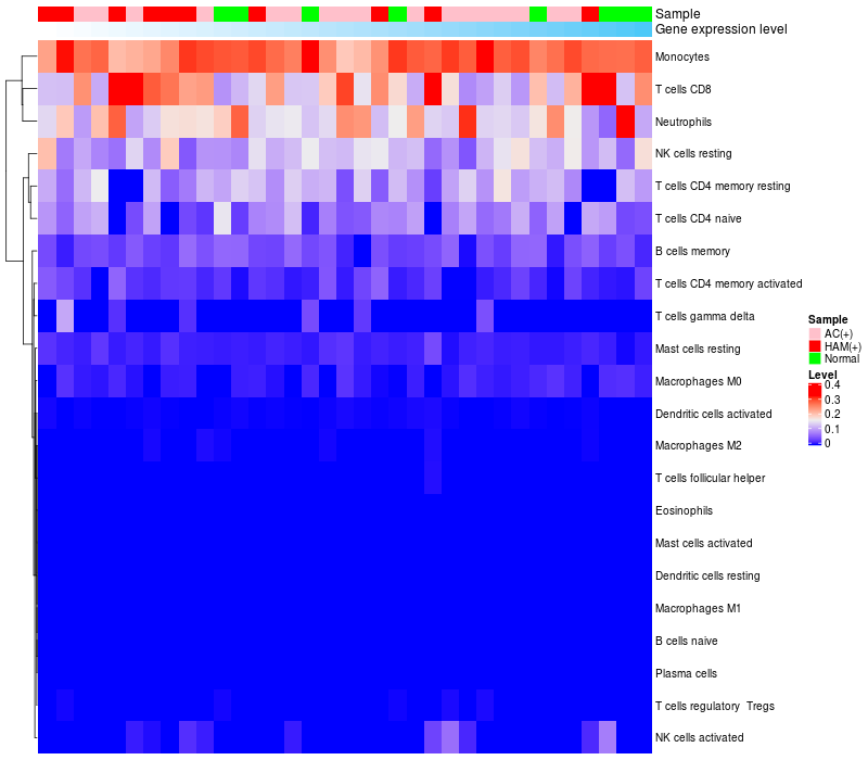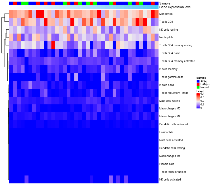 Normal (8), Asymptomatic carriers (HTLV1+)(17), HTLV-1-associated myelopathy (HTLV1+)(10) |