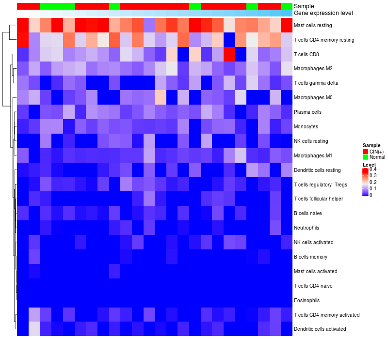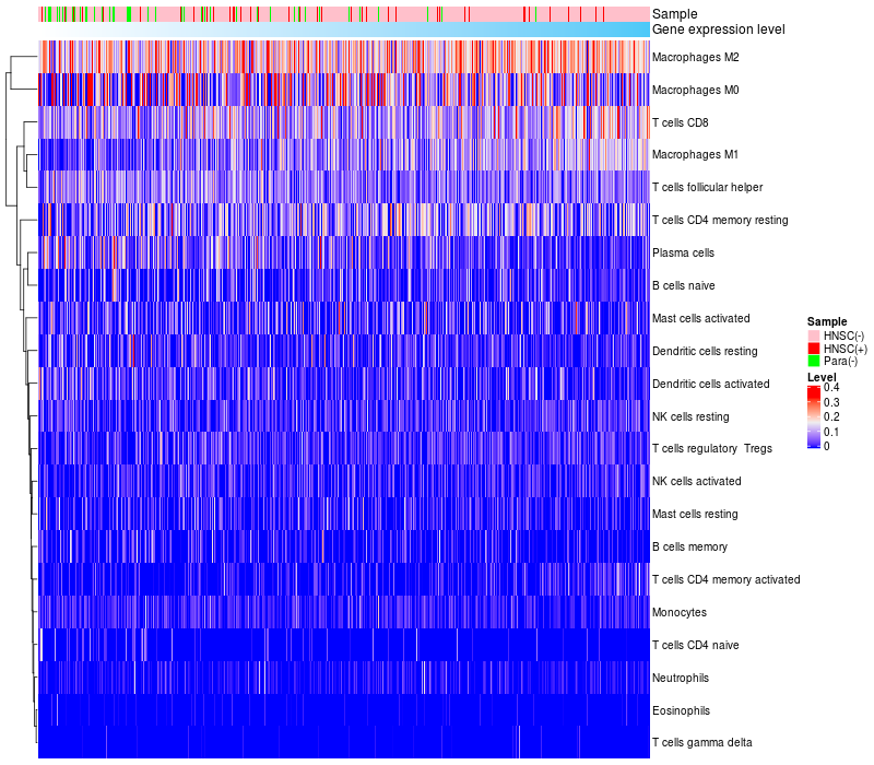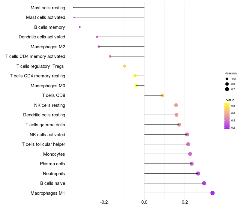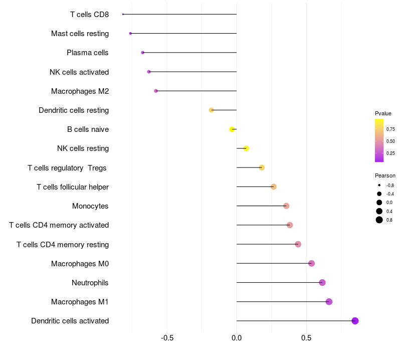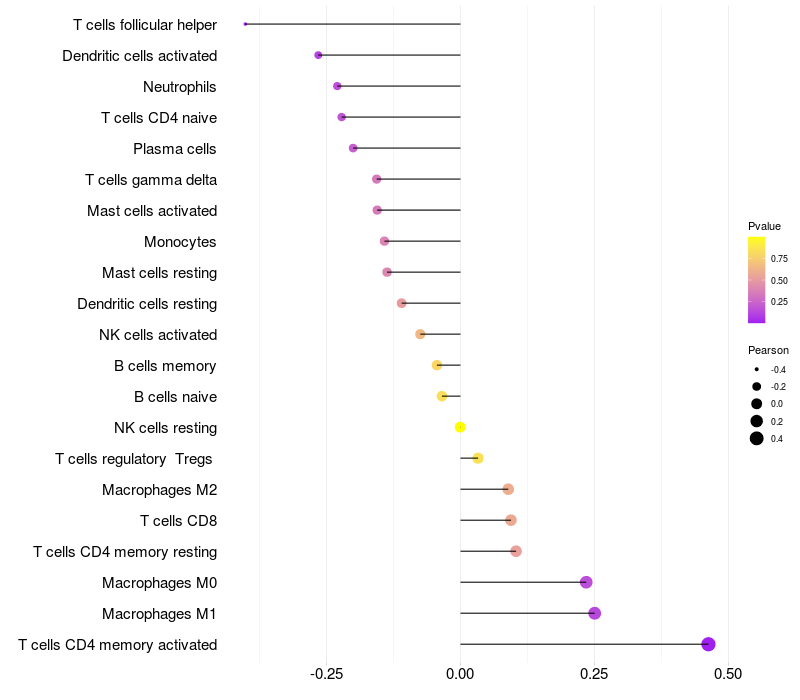 Lollipop of PDCD1LG2 expression and immune infiltrating cell level correlation result in HPV+ samples