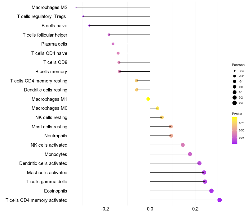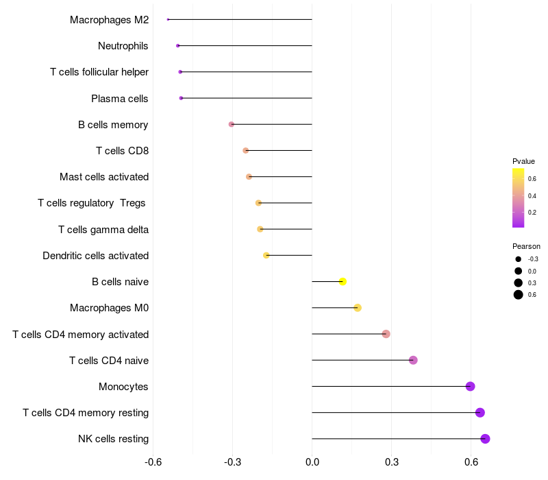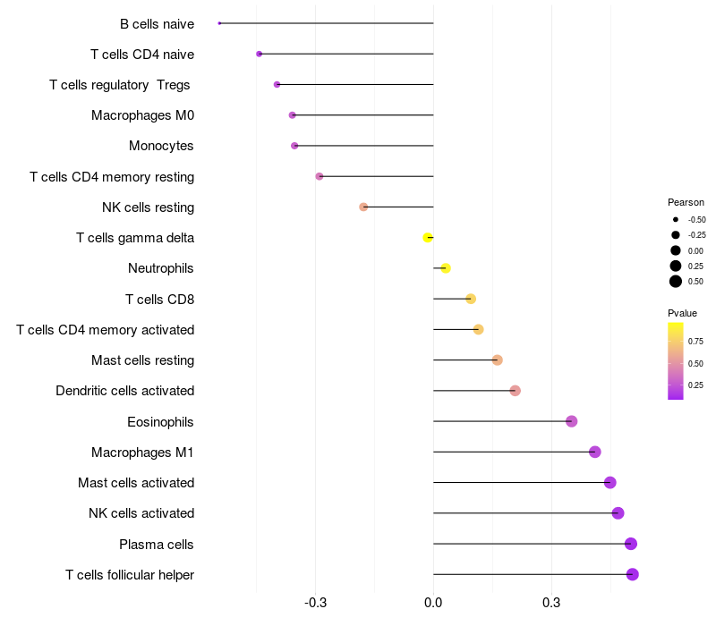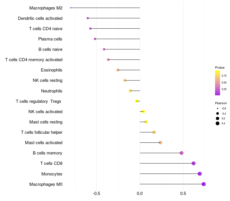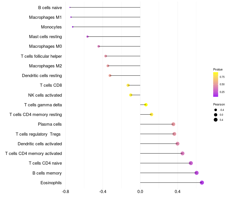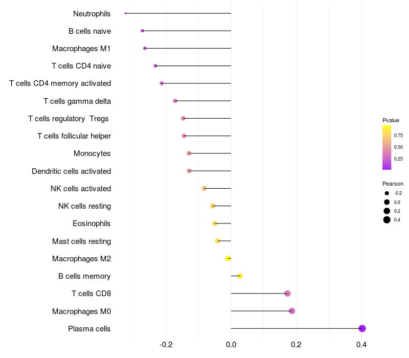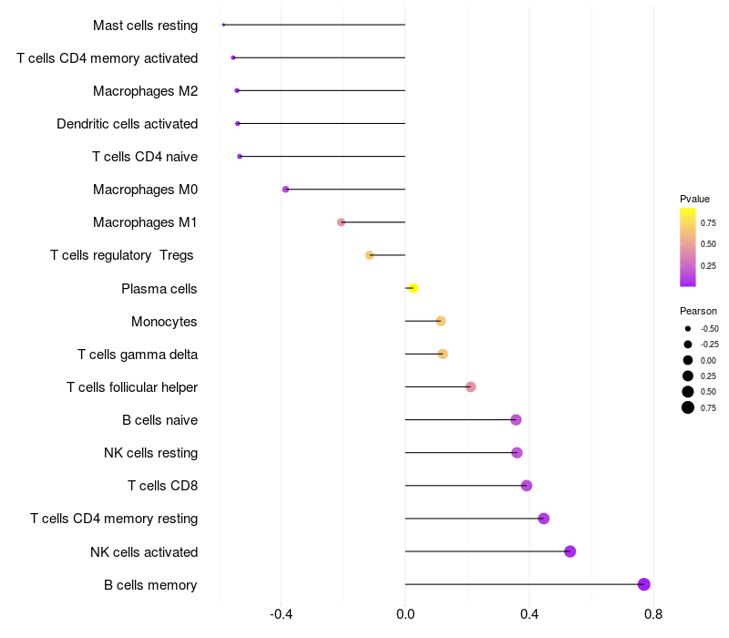 Lollipop of PDE4D expression and immune infiltrating cell level correlation result in EBV+ samples