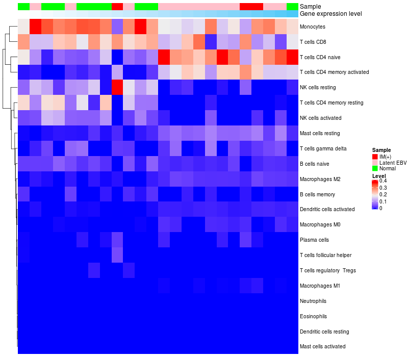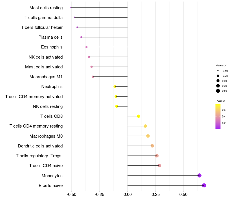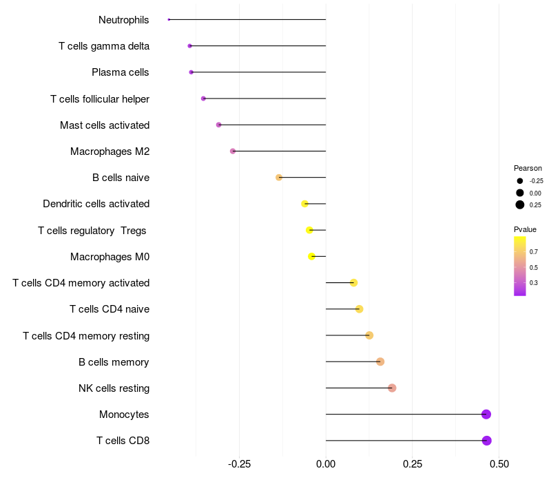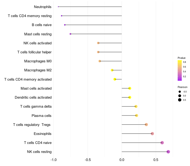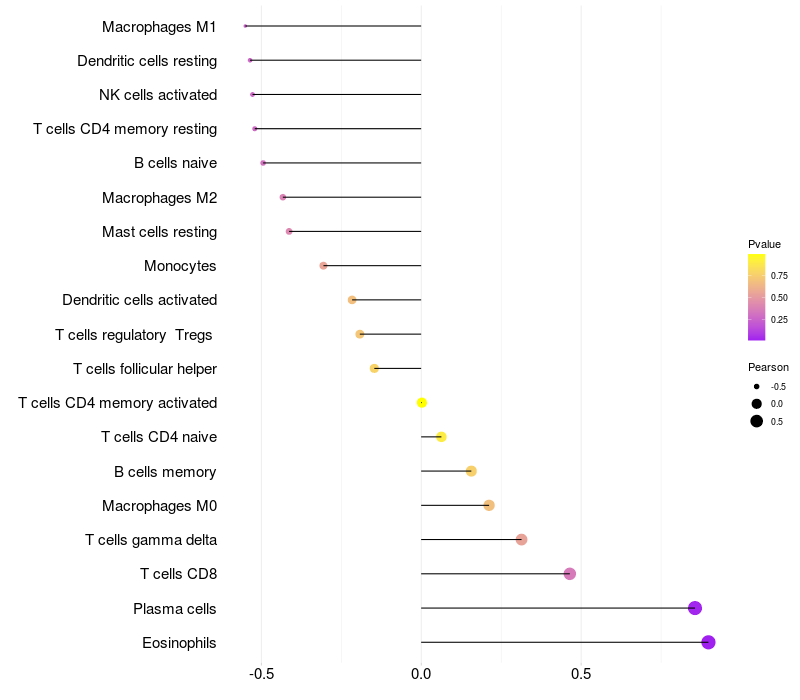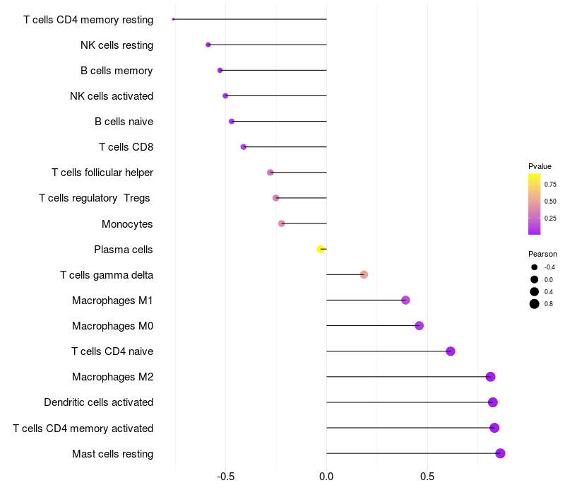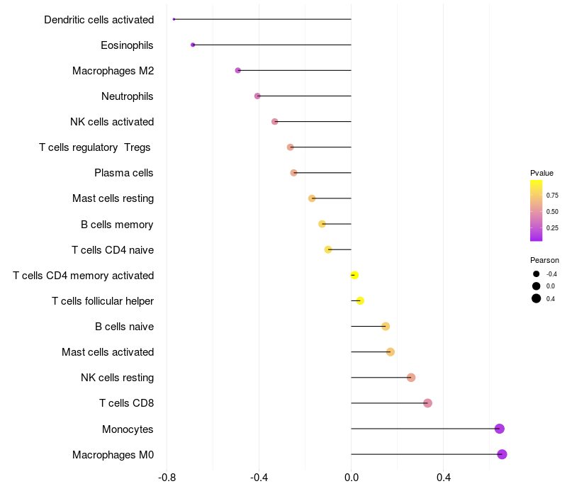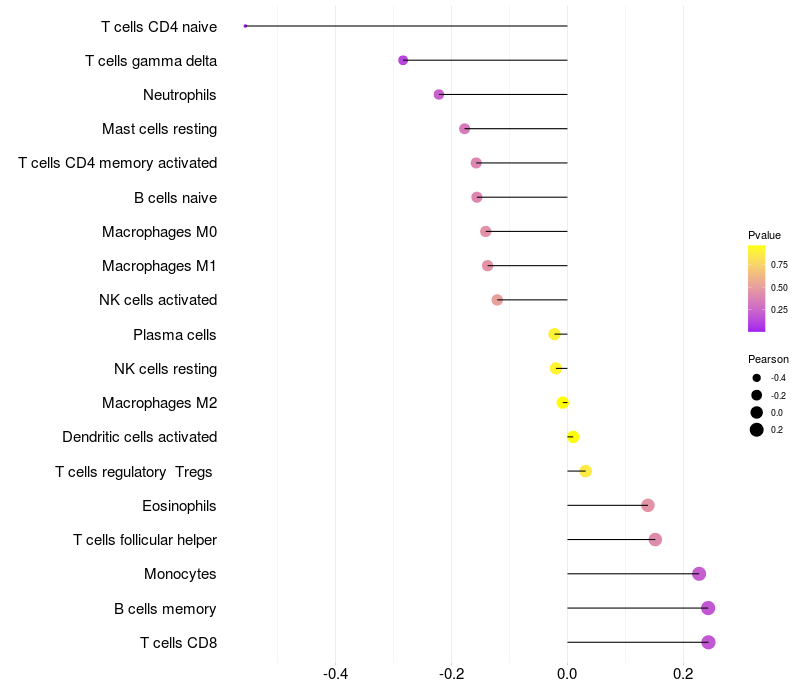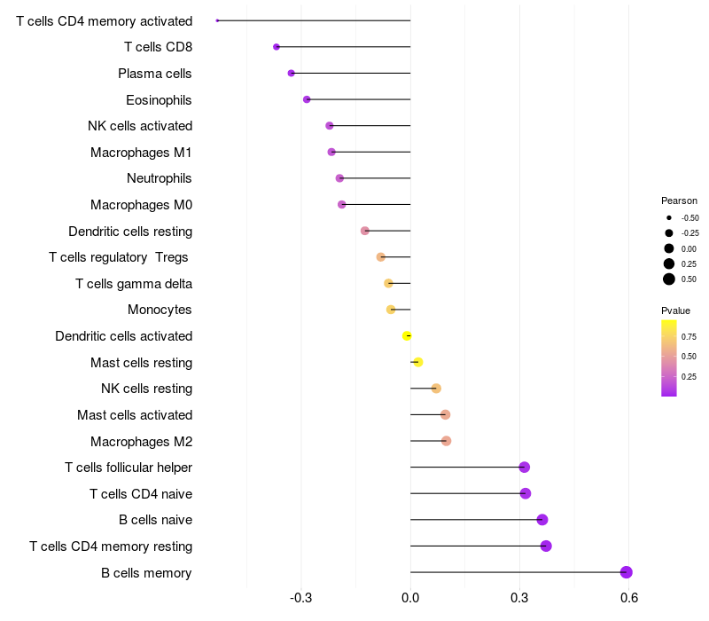 Lollipop of PDE7B expression and immune infiltrating cell level correlation result in EBV+ samples
