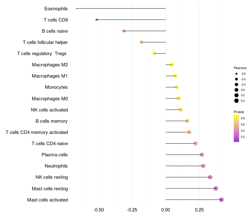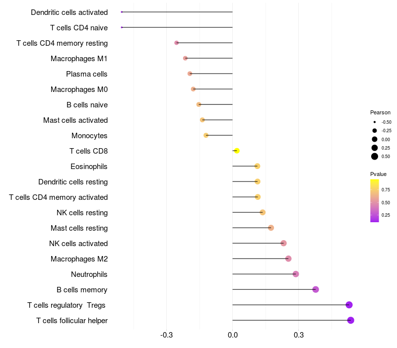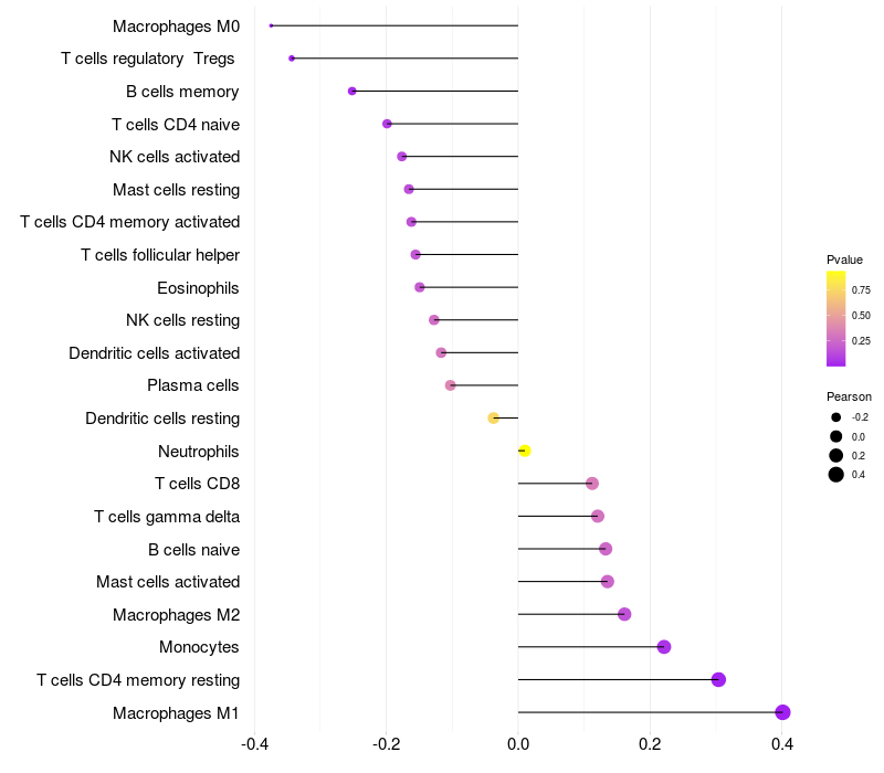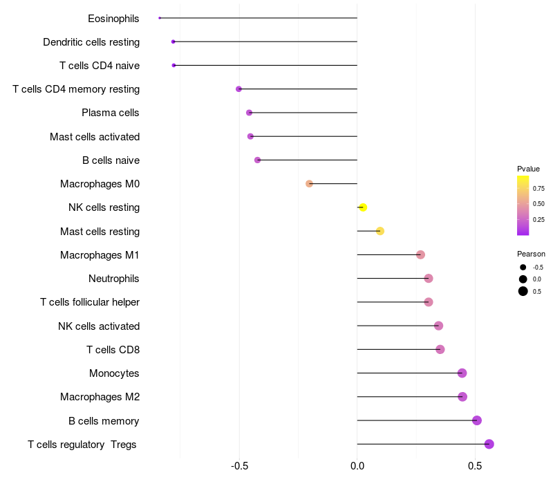 Lollipop of PDE8A expression and immune infiltrating cell level correlation result in HBV+ Liver cirrhosis samples