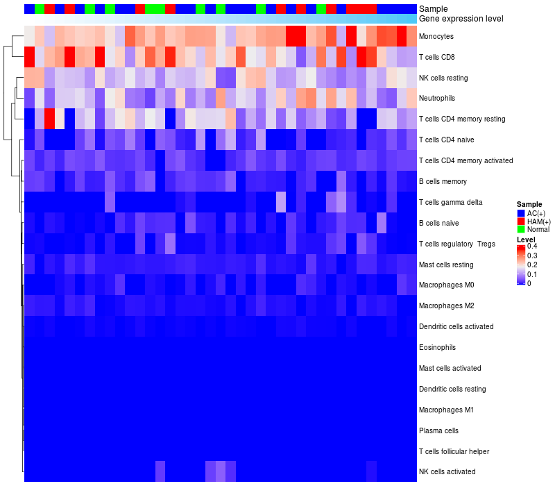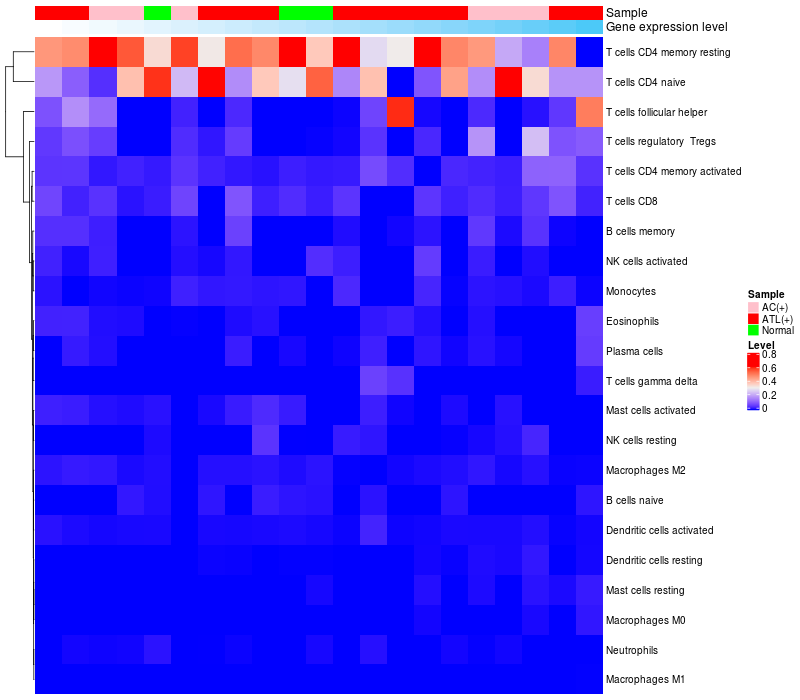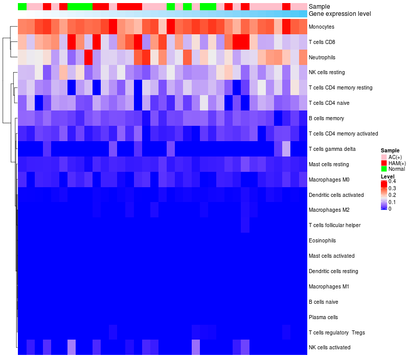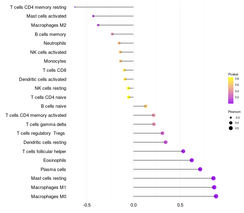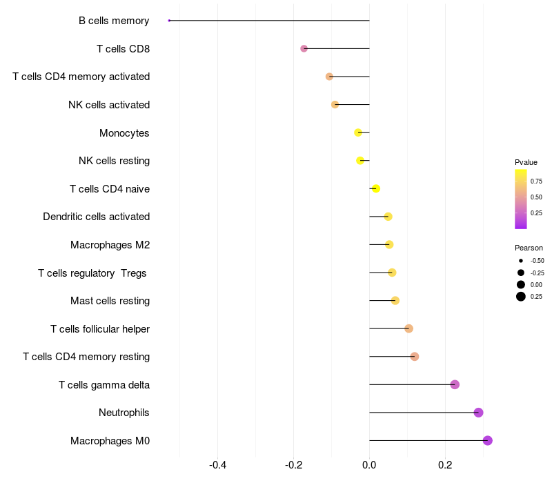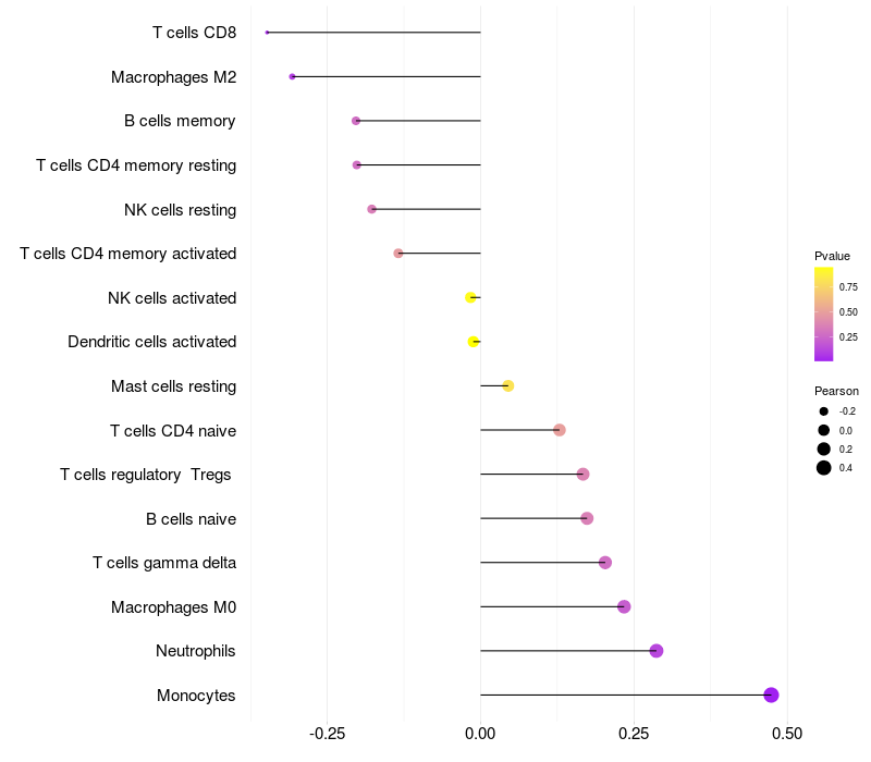 Lollipop of PDGFC expression and immune infiltrating cell level correlation result in HTLV1+ samples