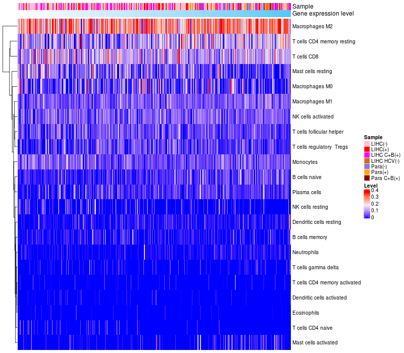 Liver hepatocellular carcinoma HCV (HBV+)(86), Liver hepatocellular carcinoma HCV (HBV-)(19), Liver hepatocellular carcinoma (HBV+)(209), Liver hepatocellular carcinoma (HBV+)(60), Paracancerous HCV (HBV+)(4), Paracancerous (HBV-)(28), Paracancerous (HBV+)(18) |