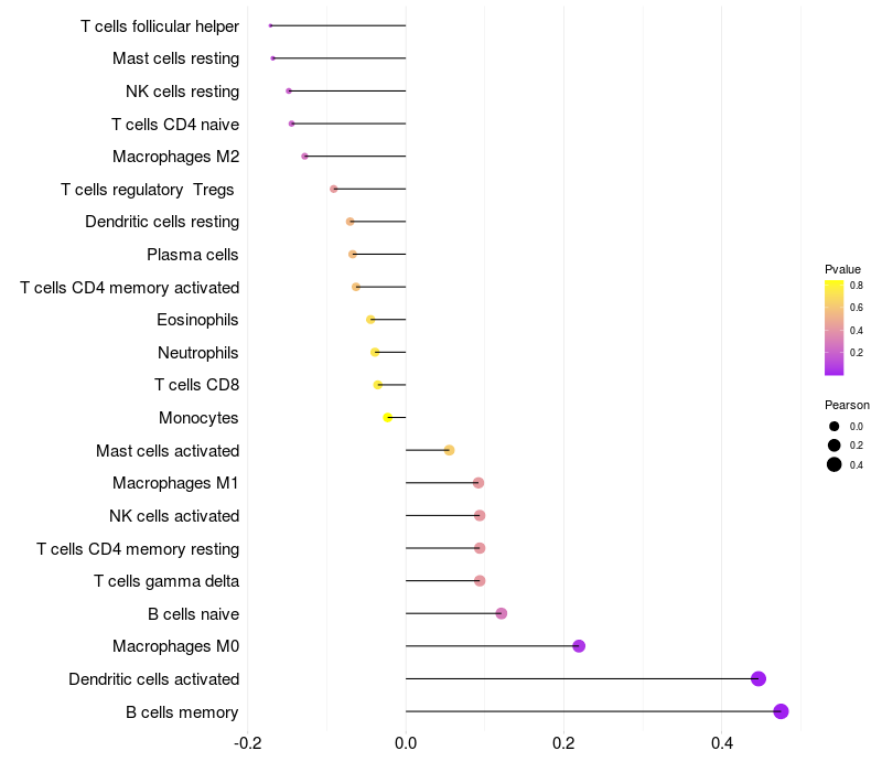 Lollipop of PDGFRA expression and immune infiltrating cell level correlation result in HBV+ samples