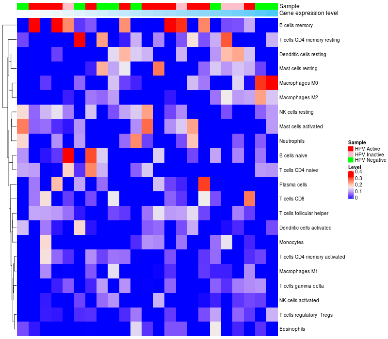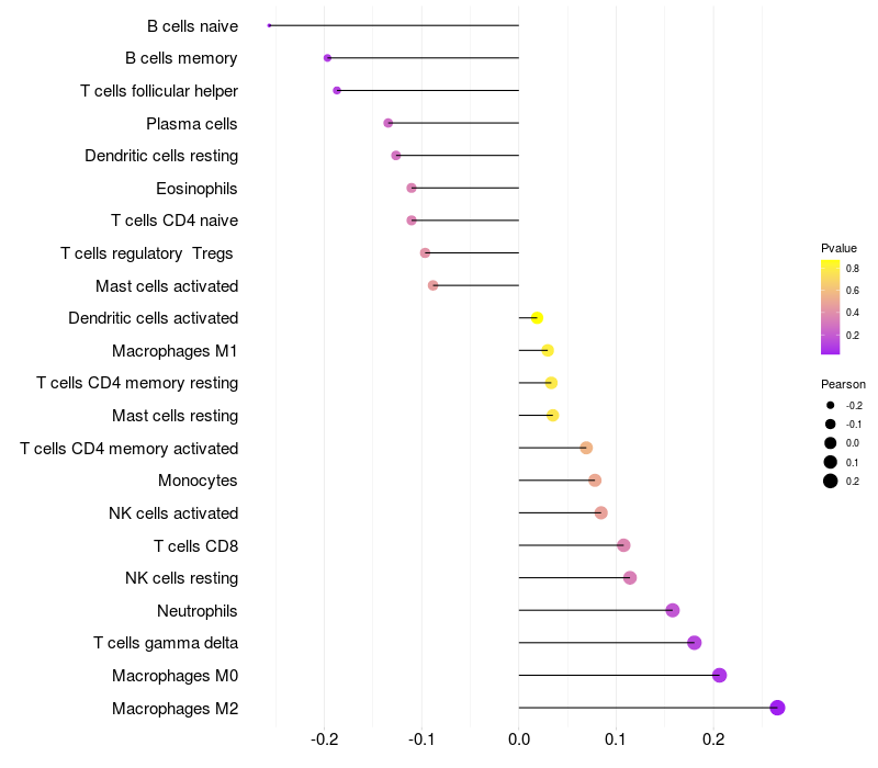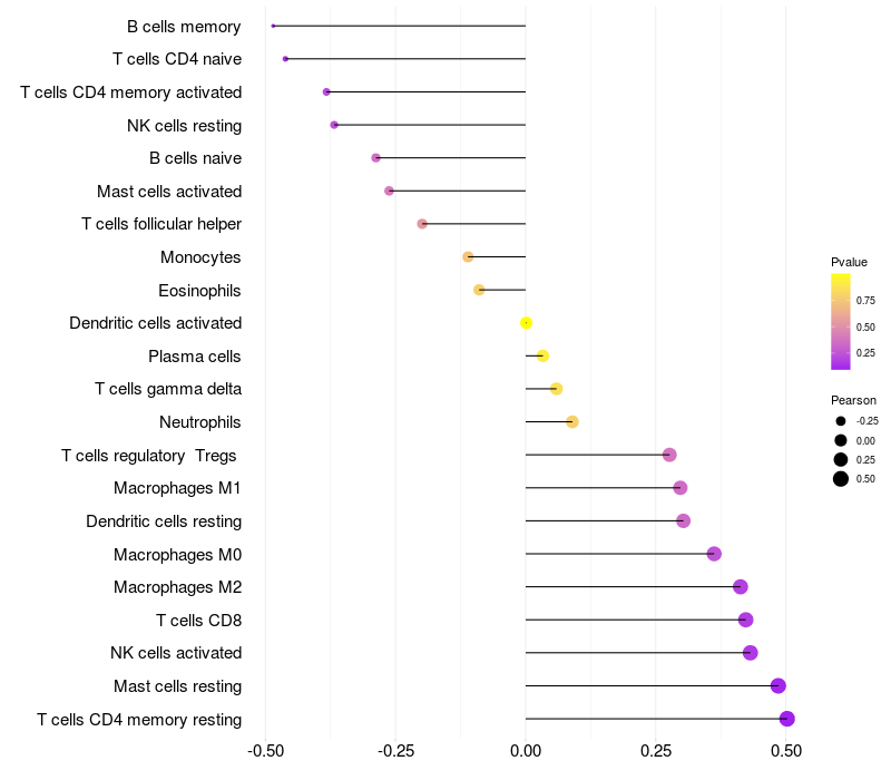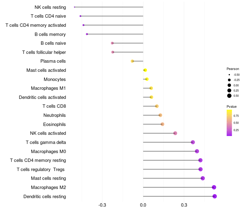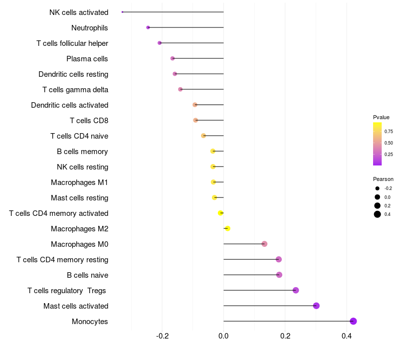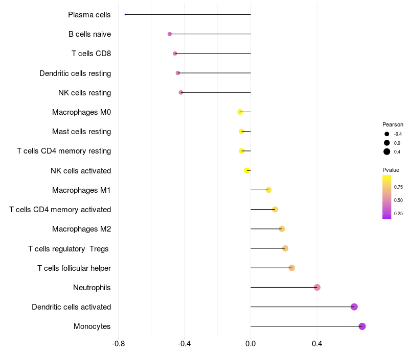 Lollipop of PDGFRL expression and immune infiltrating cell level correlation result in HPV+ samples