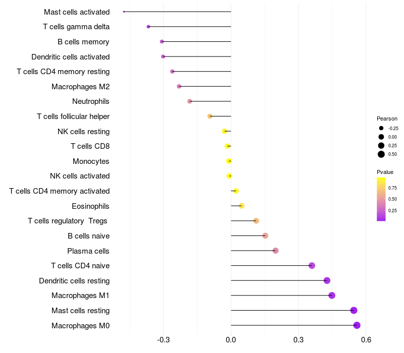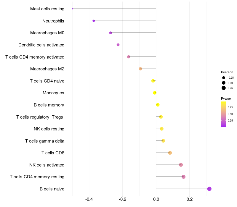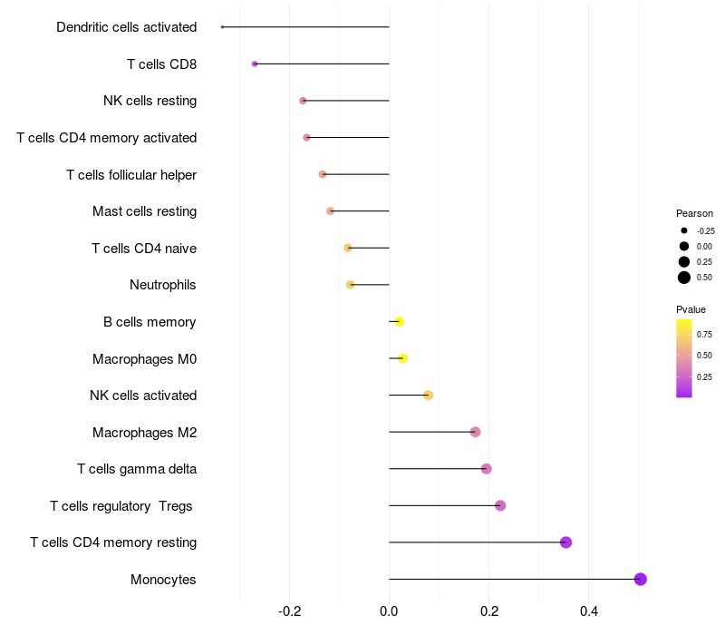Lollipop of PDIA5 expression and immune infiltrating cell level correlation result in HTLV1+ samples