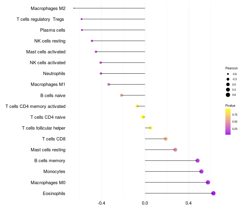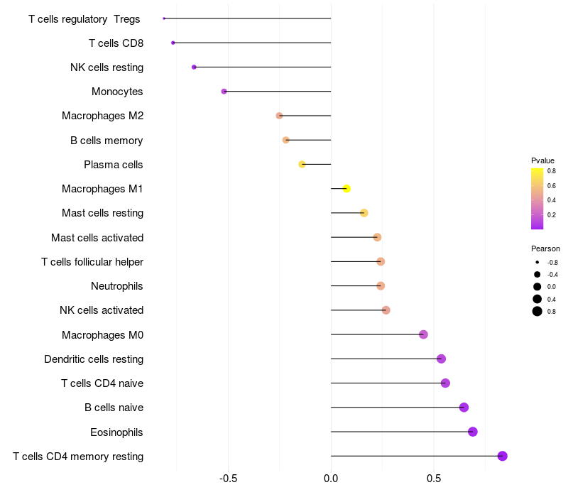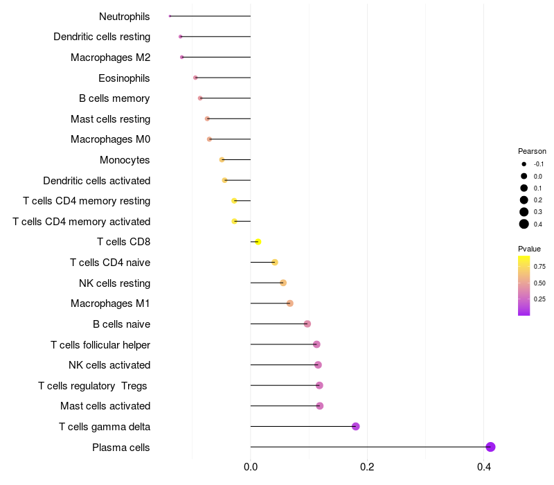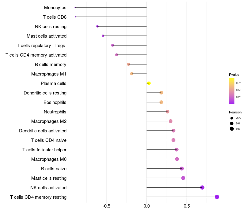 Lollipop of PDLIM1 expression and immune infiltrating cell level correlation result in HBV+ Liver cirrhosis samples