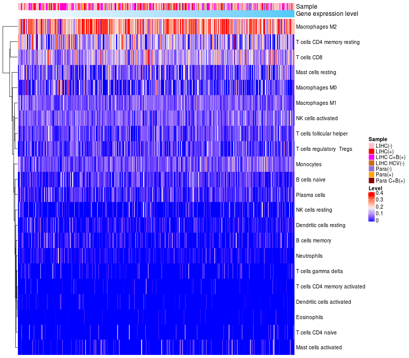 Liver hepatocellular carcinoma HCV (HBV+)(86), Liver hepatocellular carcinoma HCV (HBV-)(19), Liver hepatocellular carcinoma (HBV+)(209), Liver hepatocellular carcinoma (HBV+)(60), Paracancerous HCV (HBV+)(4), Paracancerous (HBV-)(28), Paracancerous (HBV+)(18) |