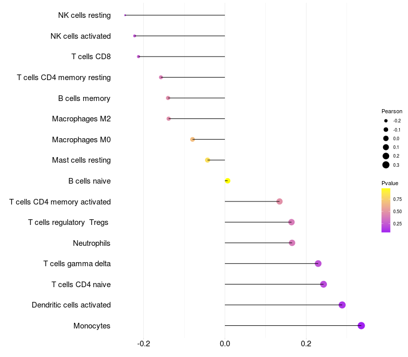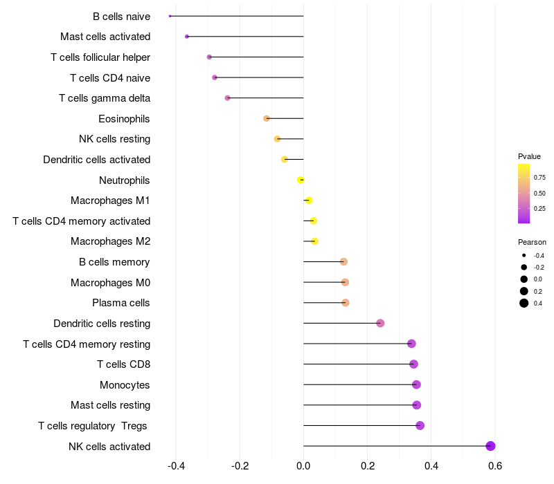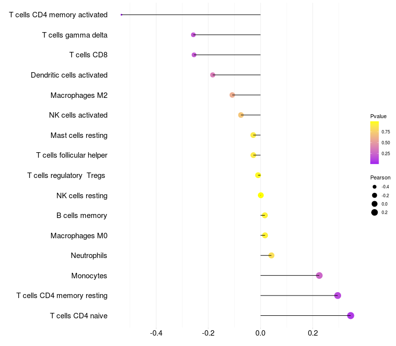 Lollipop of PDLIM2 expression and immune infiltrating cell level correlation result in HTLV1+ samples