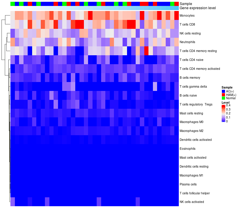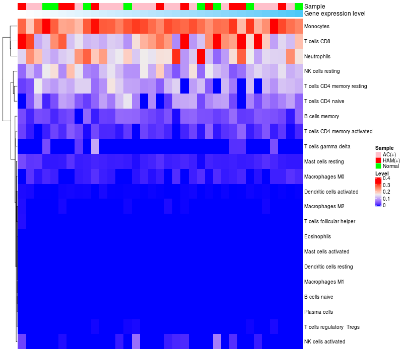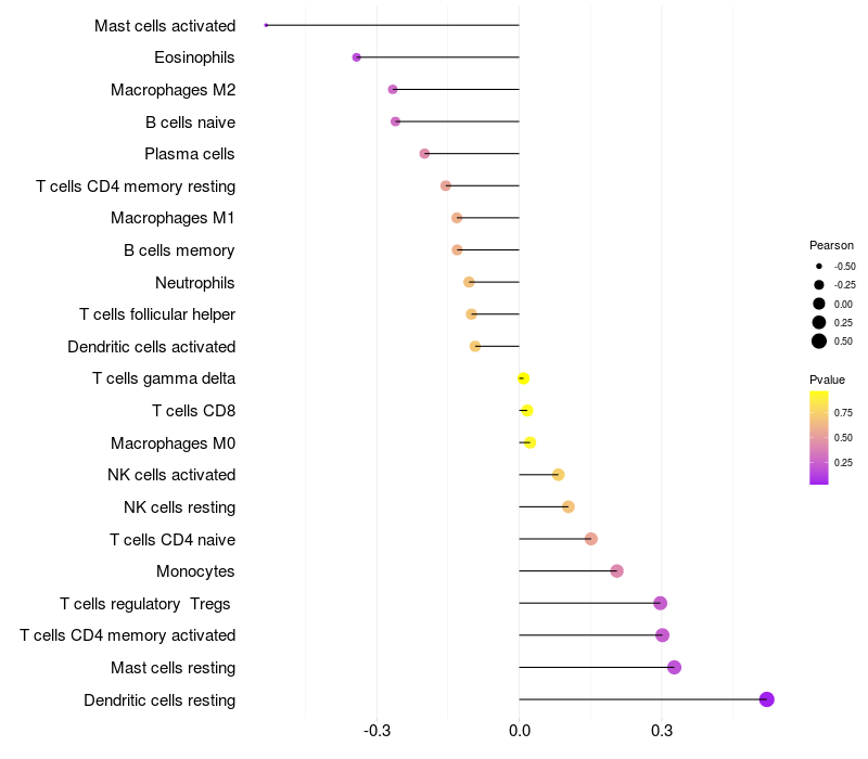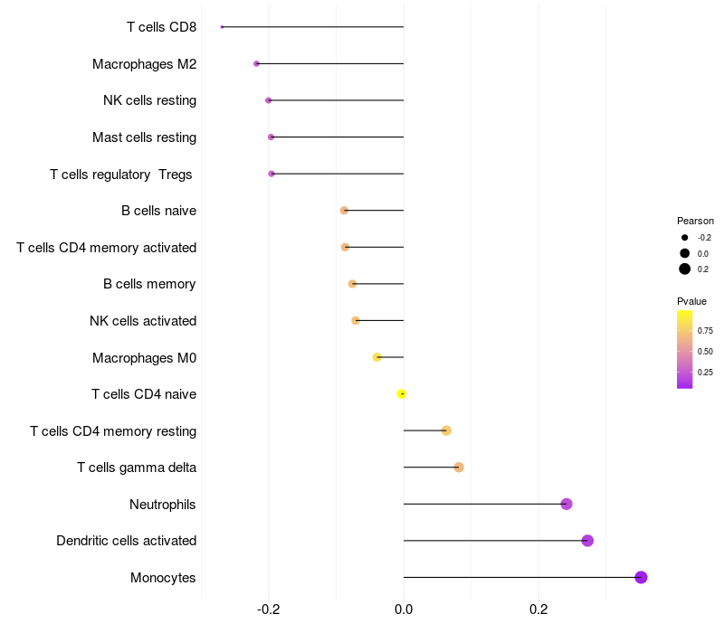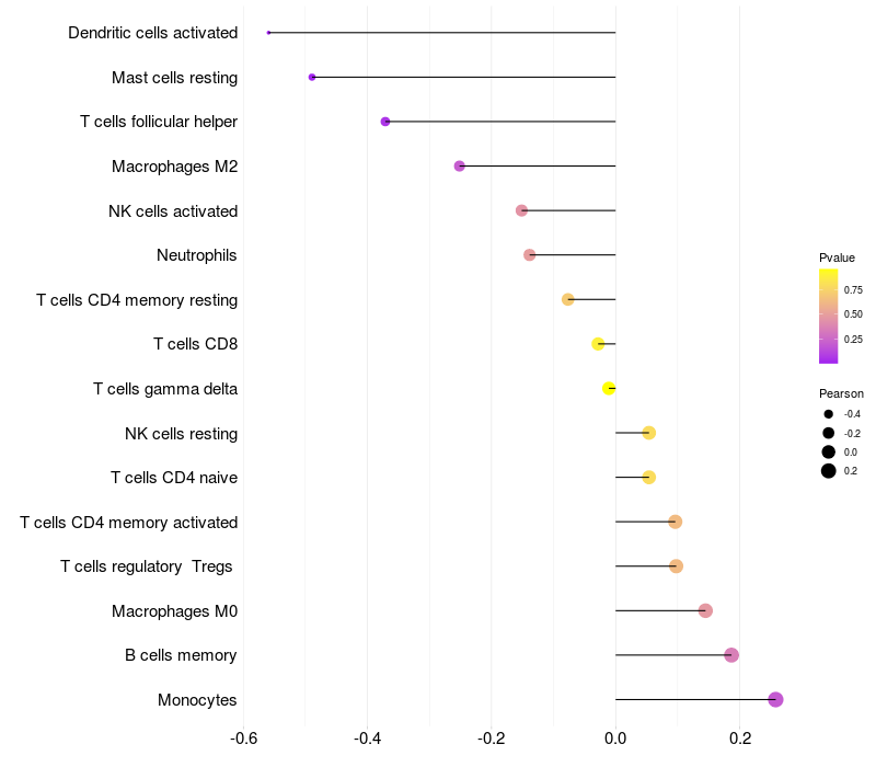 Lollipop of PDLIM3 expression and immune infiltrating cell level correlation result in HTLV1+ samples