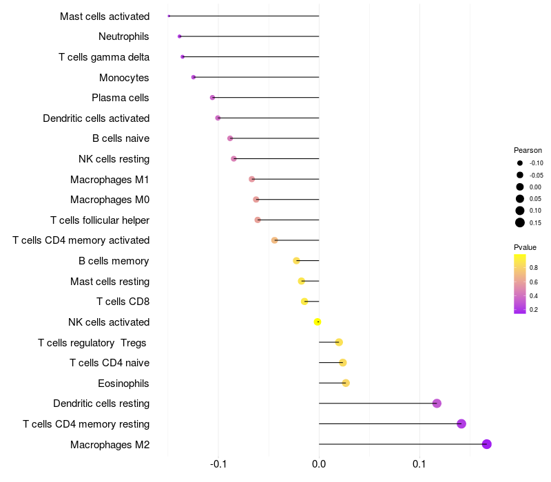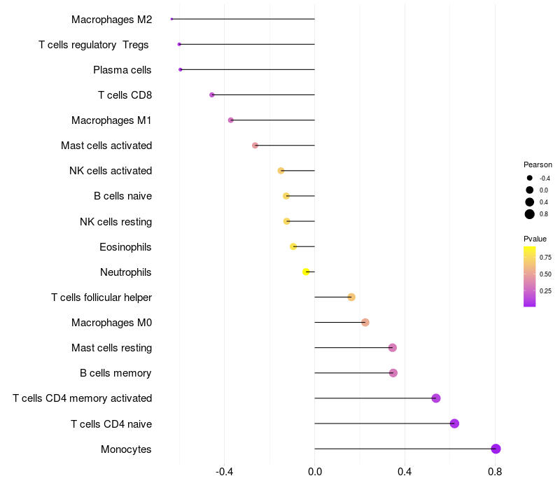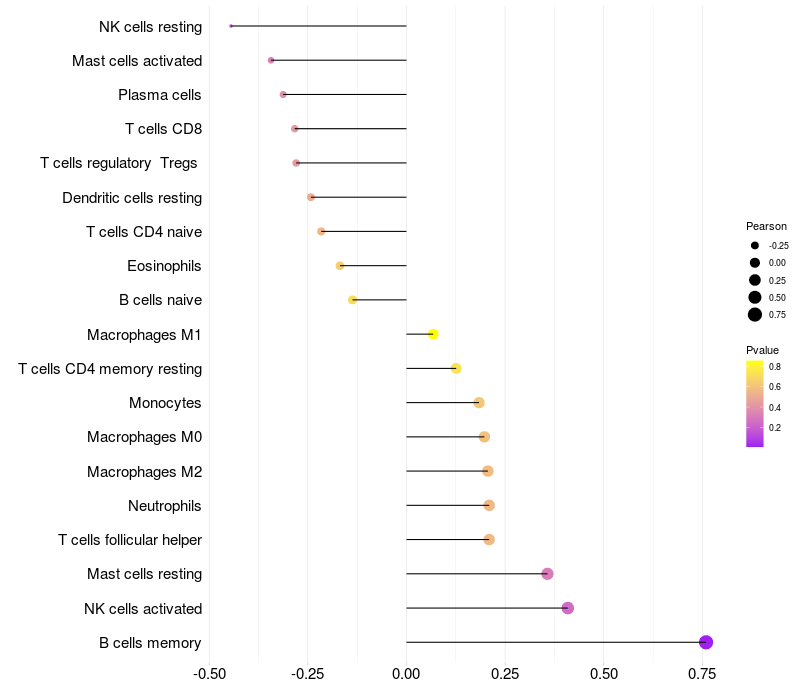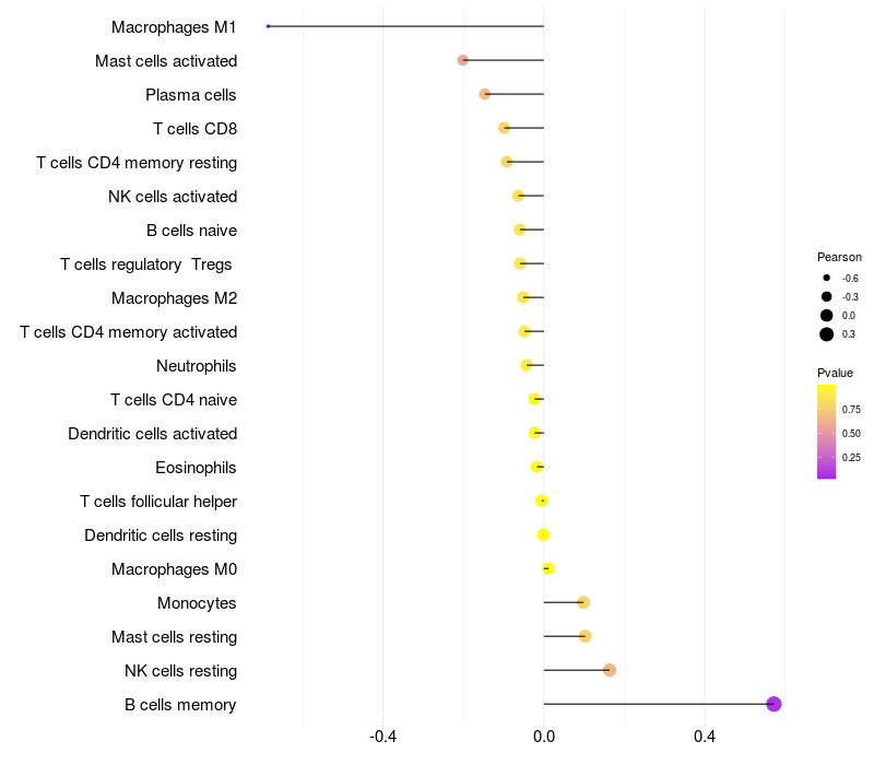 Lollipop of PDPK1 expression and immune infiltrating cell level correlation result in HBV+ Liver cirrhosis samples