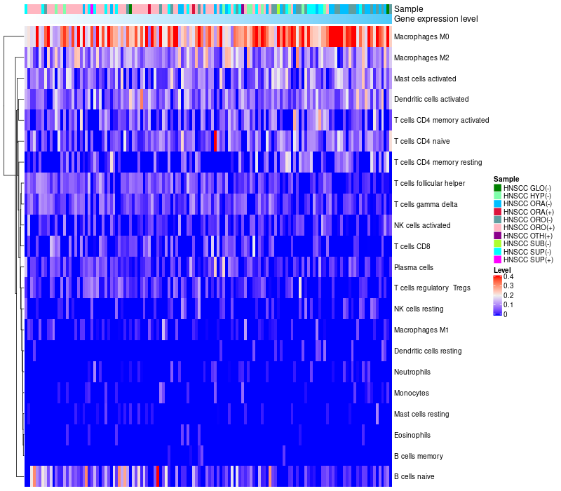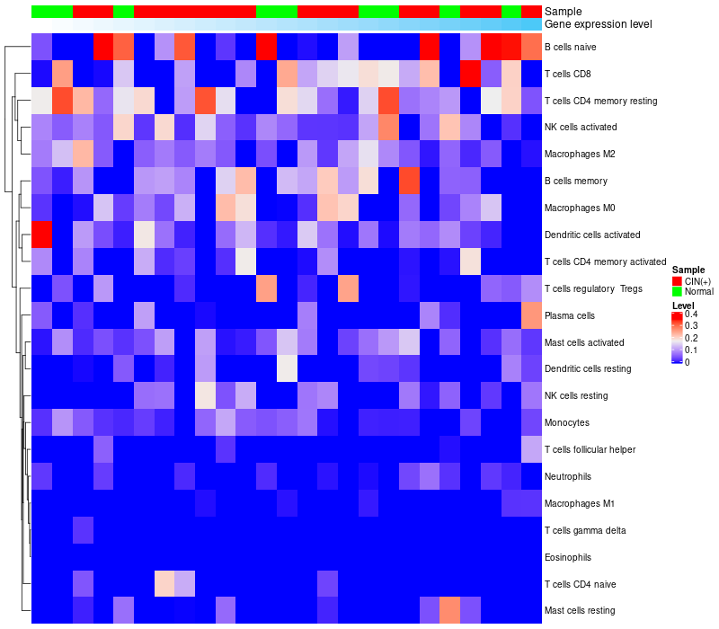 • Left: Heatmap of target gene expression and the level of various types of immune cells (cell type fractions) in all samples based on CIBERSORT method.