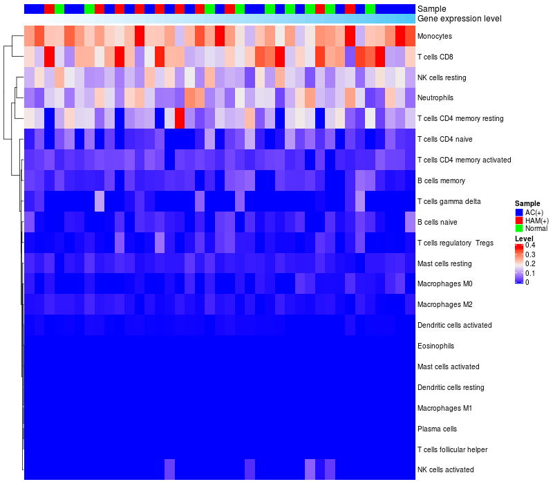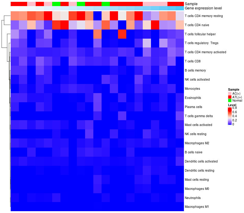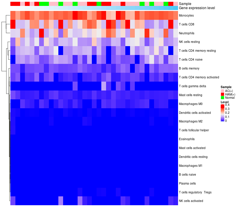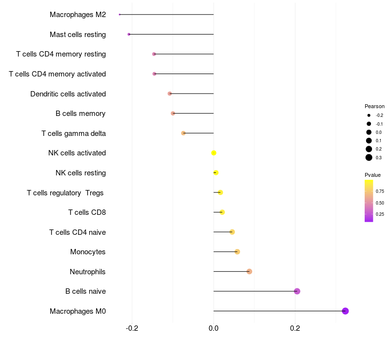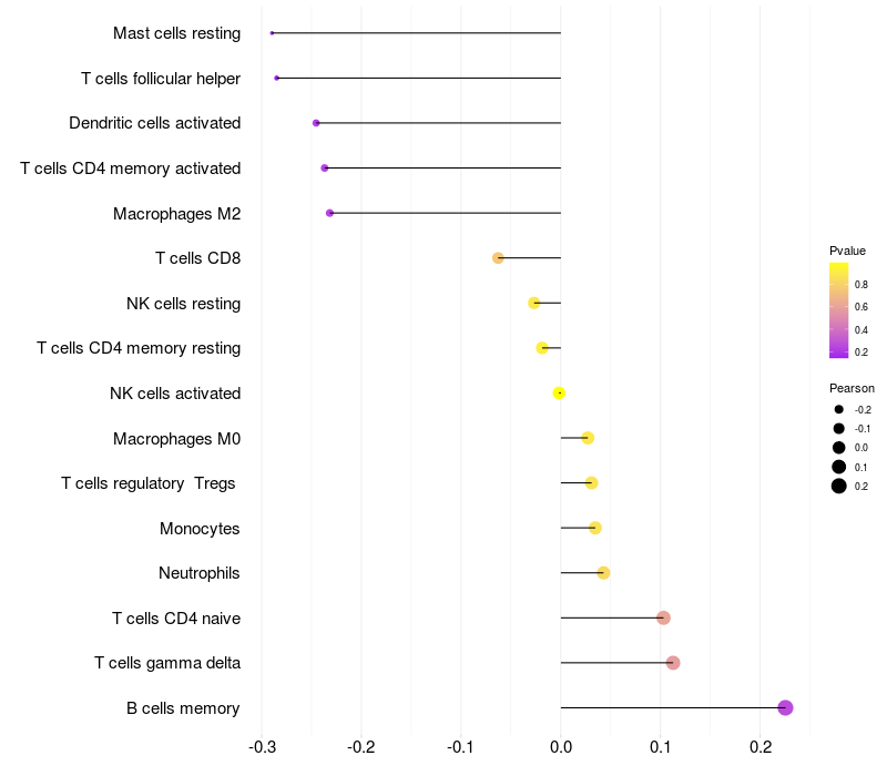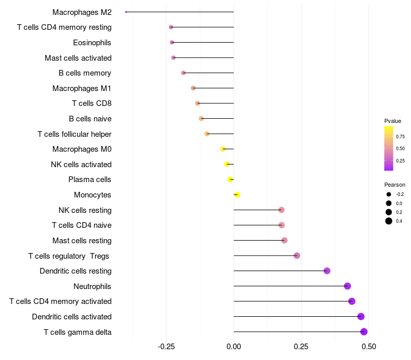 Lollipop of PEG10 expression and immune infiltrating cell level correlation result in HTLV1+ samples