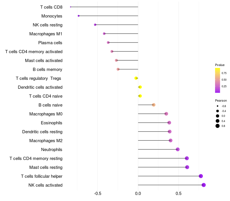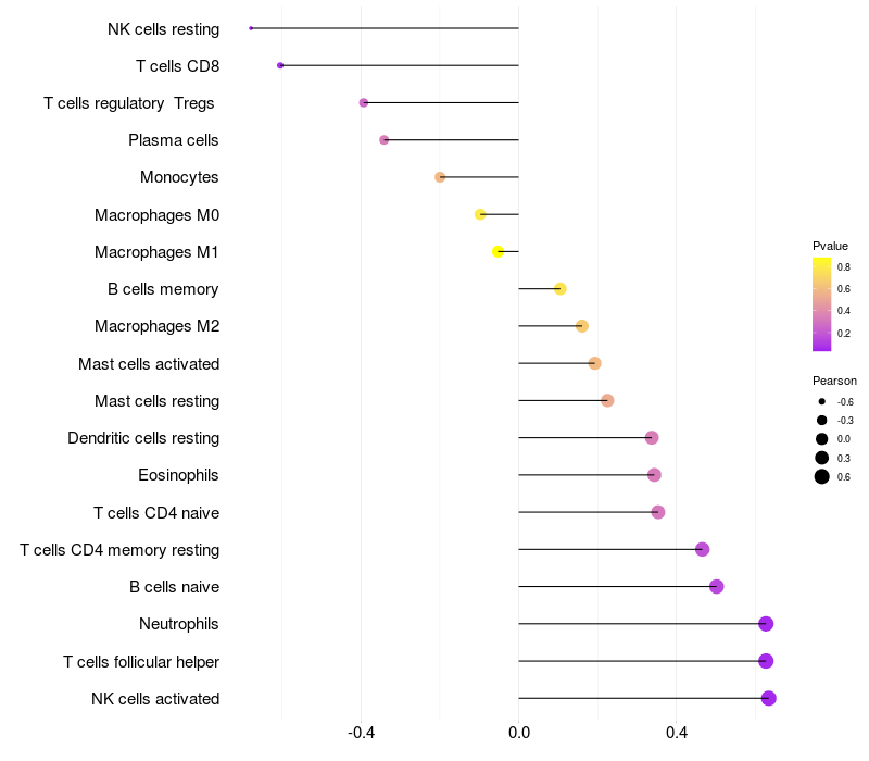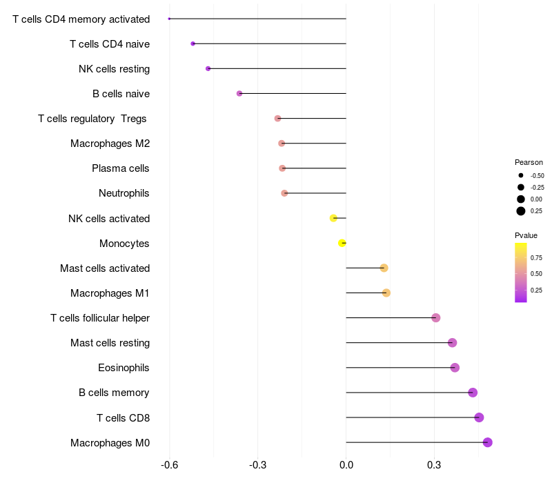 Lollipop of PEMT expression and immune infiltrating cell level correlation result in HBV+ samples