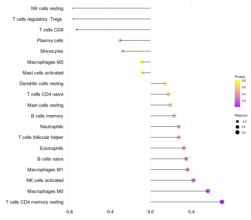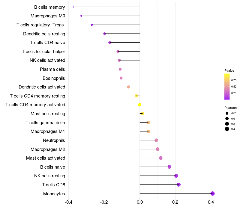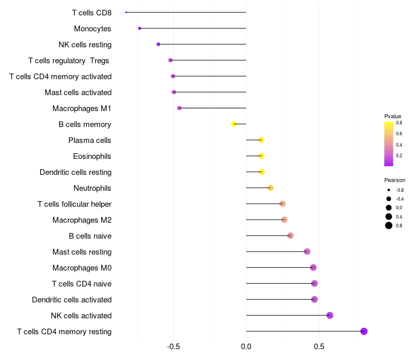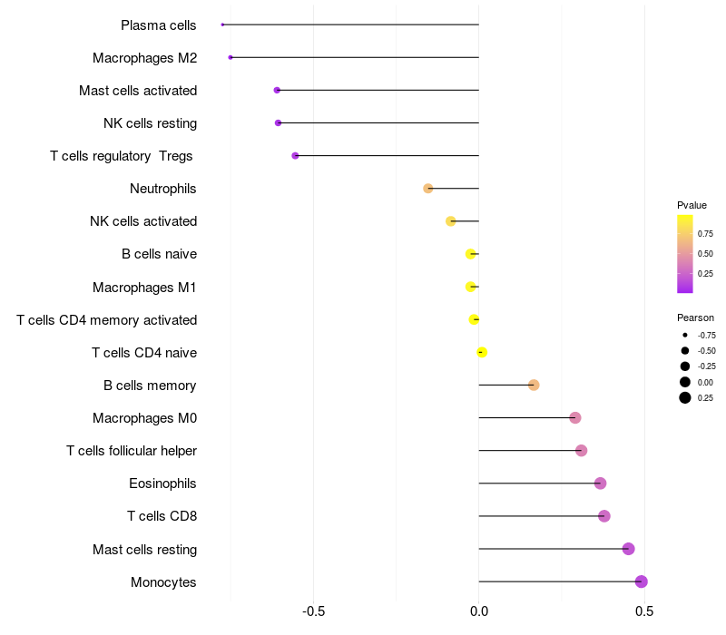 Lollipop of PEPD expression and immune infiltrating cell level correlation result in HBV+ Liver cirrhosis samples