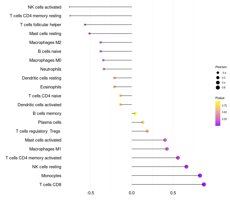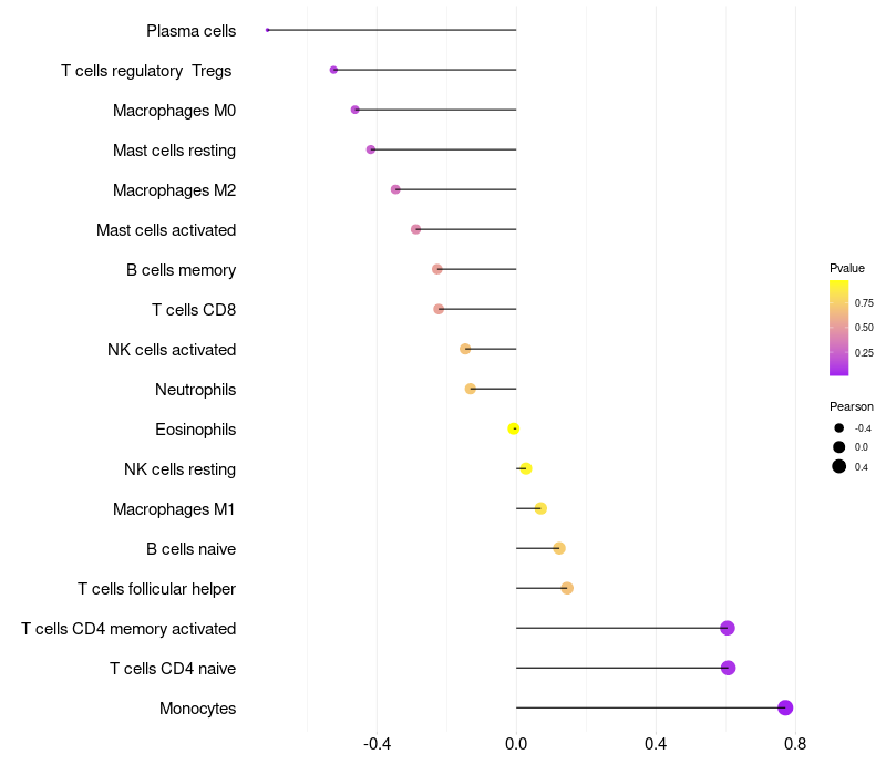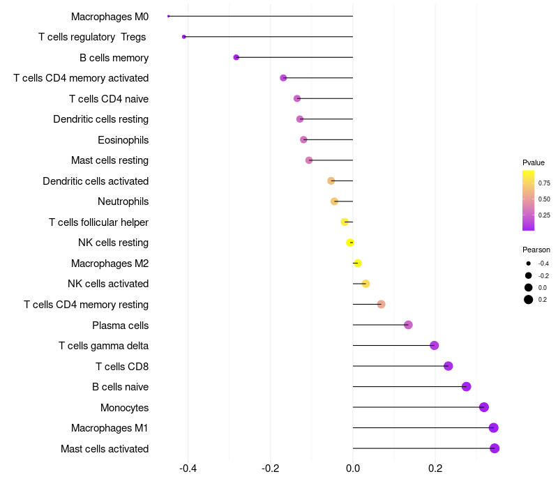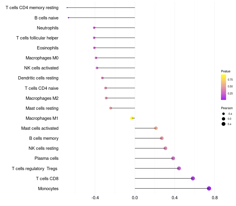 Lollipop of PER1 expression and immune infiltrating cell level correlation result in HBV+ Liver cirrhosis samples
