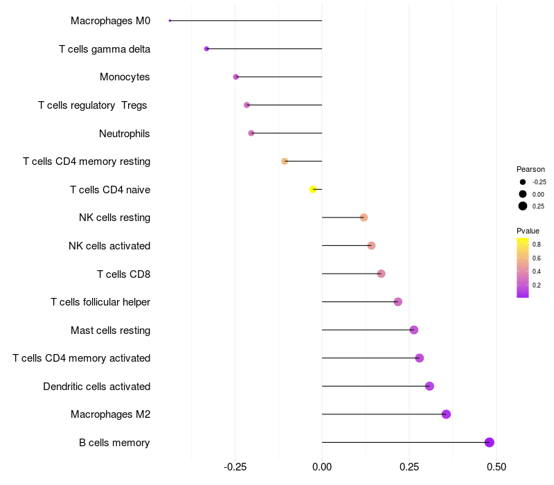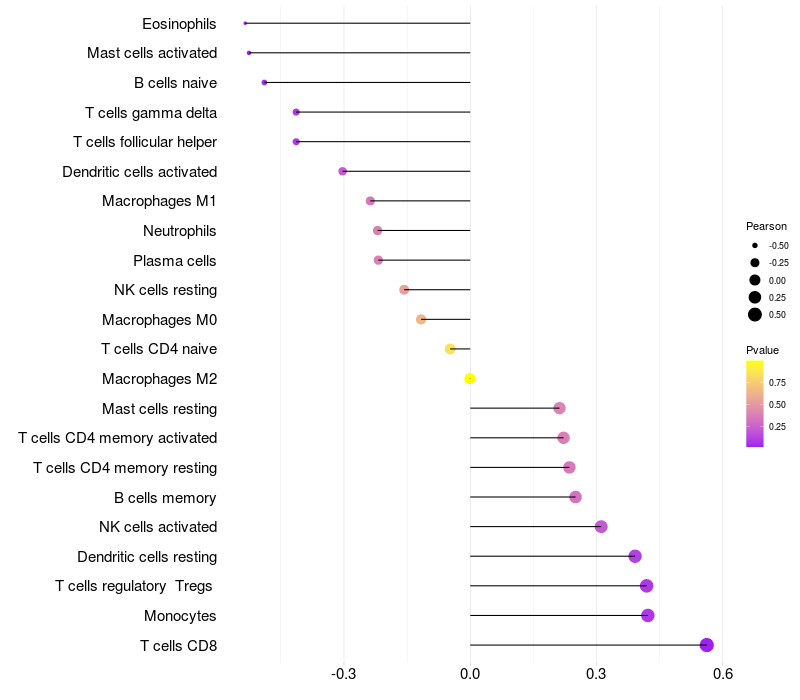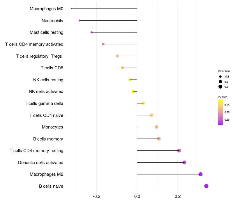 Lollipop of PEX26 expression and immune infiltrating cell level correlation result in HTLV1+ samples