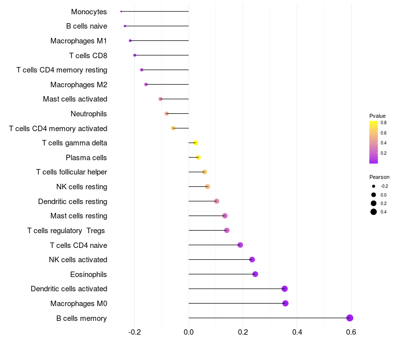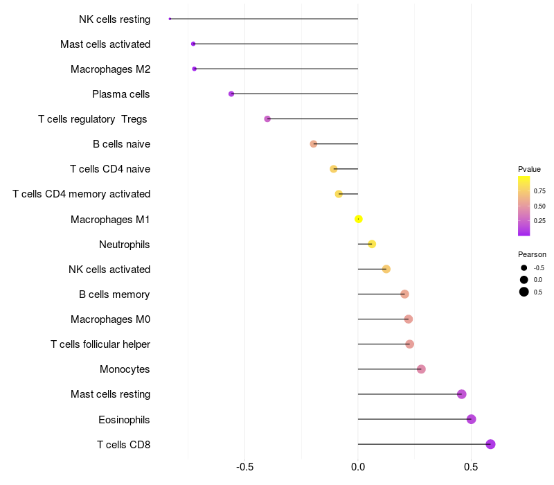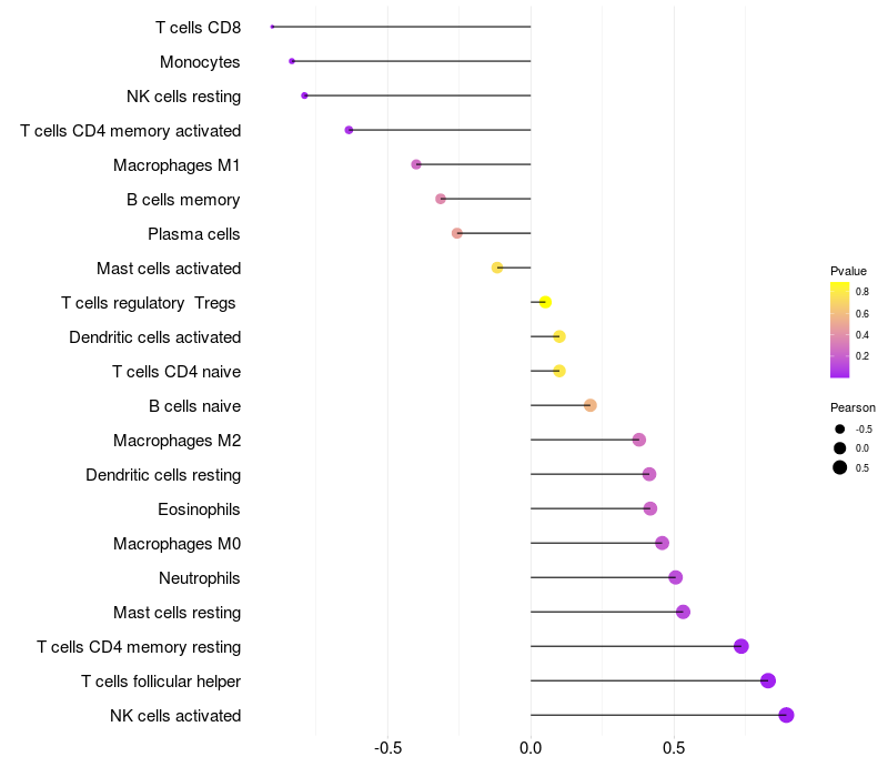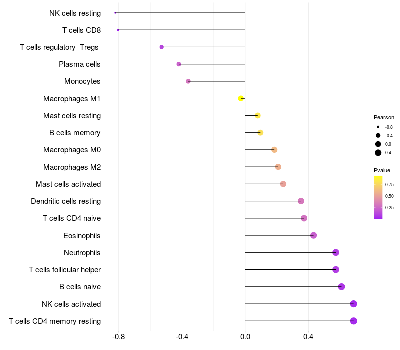 Lollipop of PFDN1 expression and immune infiltrating cell level correlation result in HBV+ Chronic HBV (CHB) infection samples