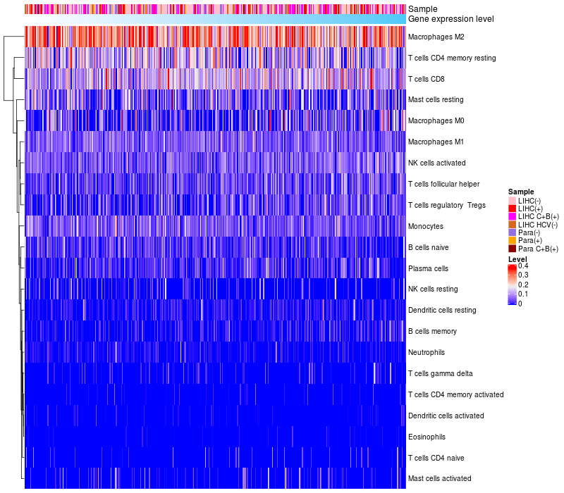 Liver hepatocellular carcinoma HCV (HBV+)(86), Liver hepatocellular carcinoma HCV (HBV-)(19), Liver hepatocellular carcinoma (HBV+)(209), Liver hepatocellular carcinoma (HBV+)(60), Paracancerous HCV (HBV+)(4), Paracancerous (HBV-)(28), Paracancerous (HBV+)(18) |
