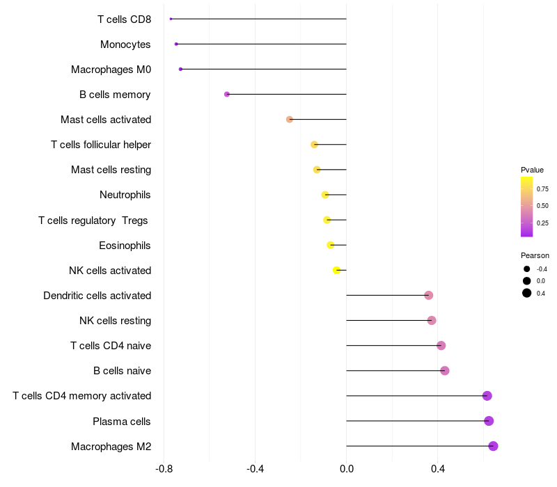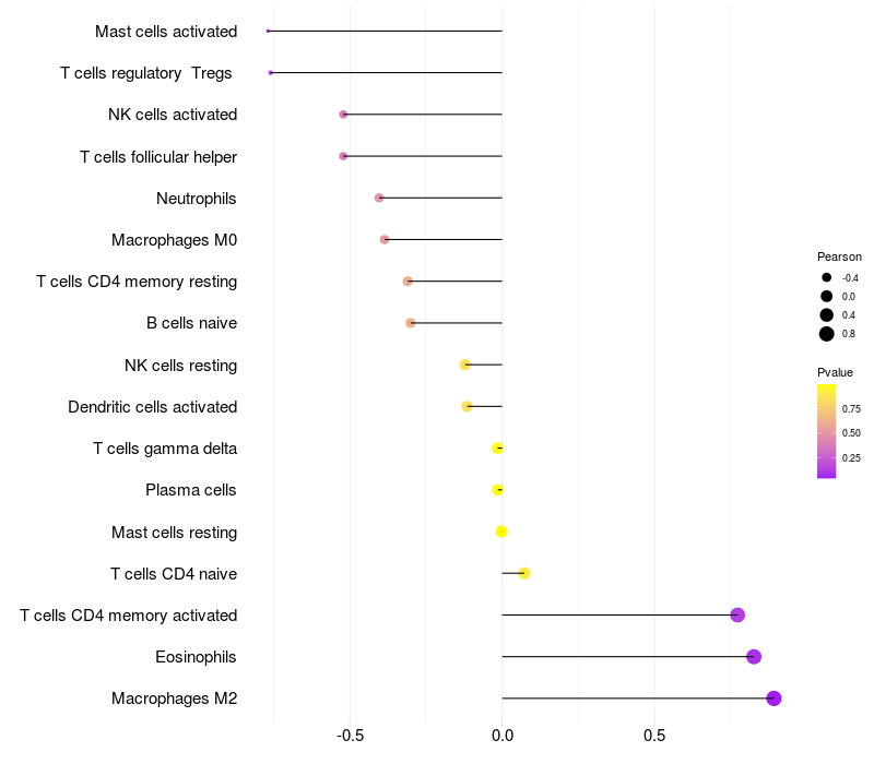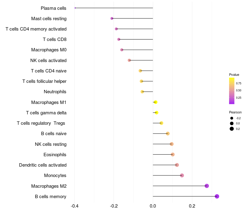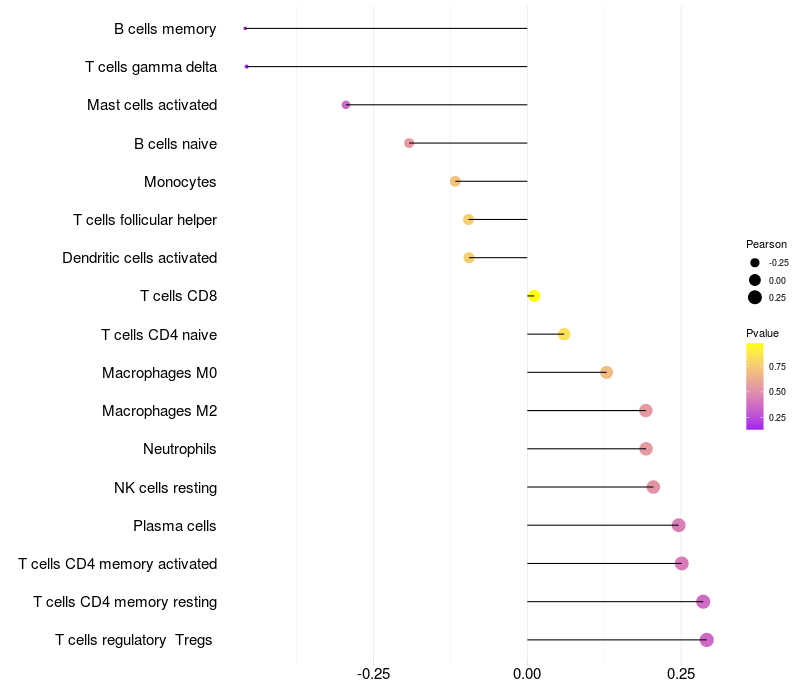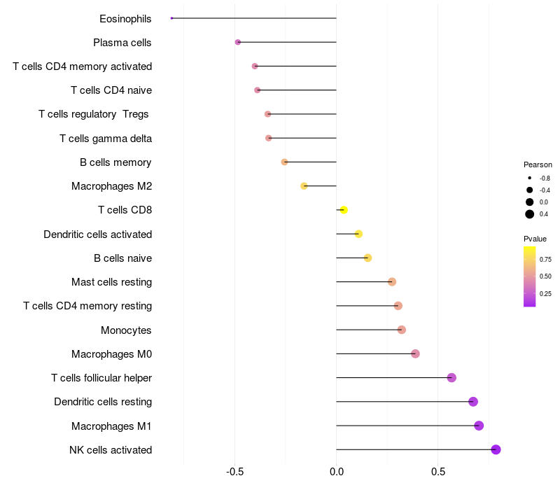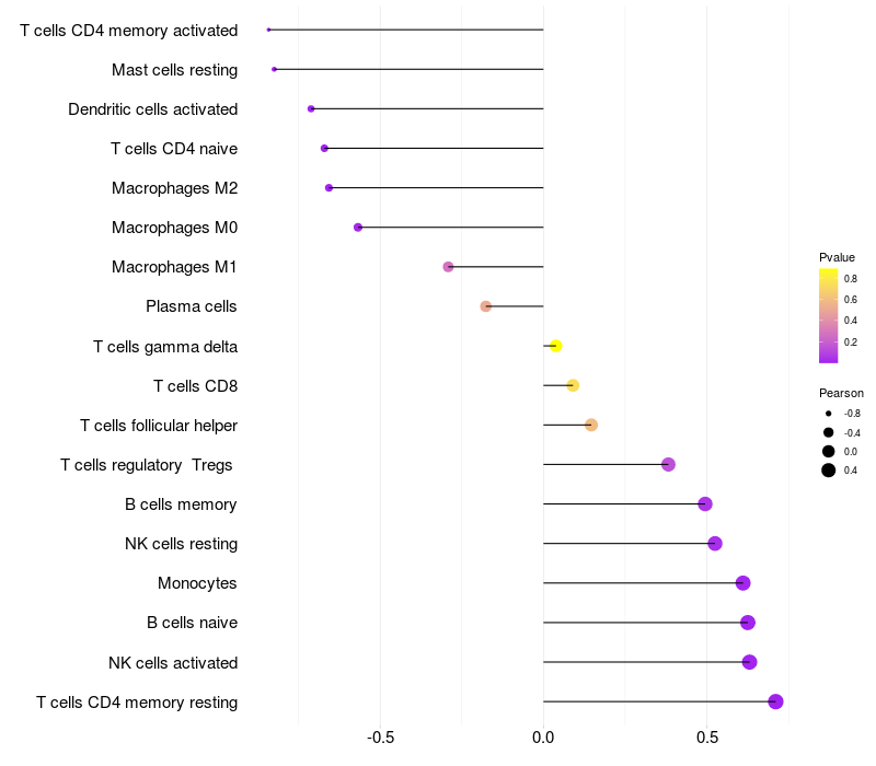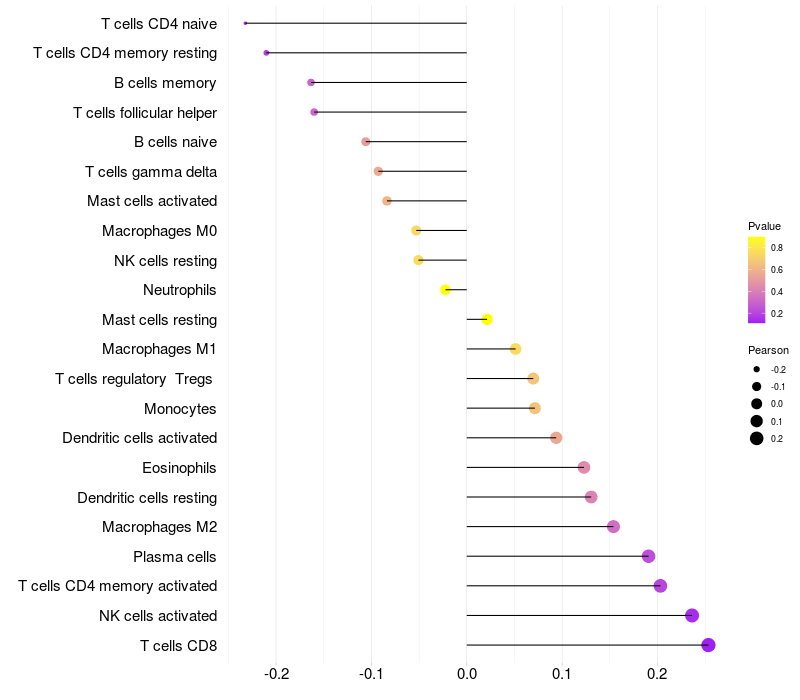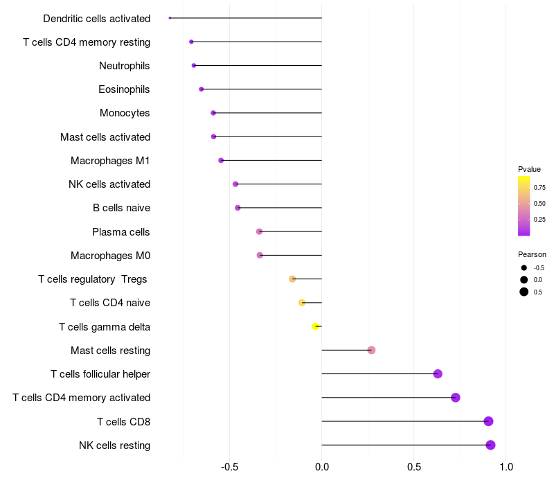 Lollipop of PFN1 expression and immune infiltrating cell level correlation result in EBV+ samples