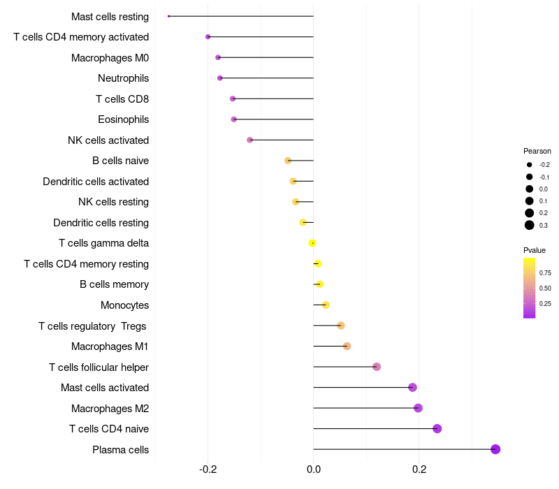 Lollipop of PGAP3 expression and immune infiltrating cell level correlation result in HPV+ samples
