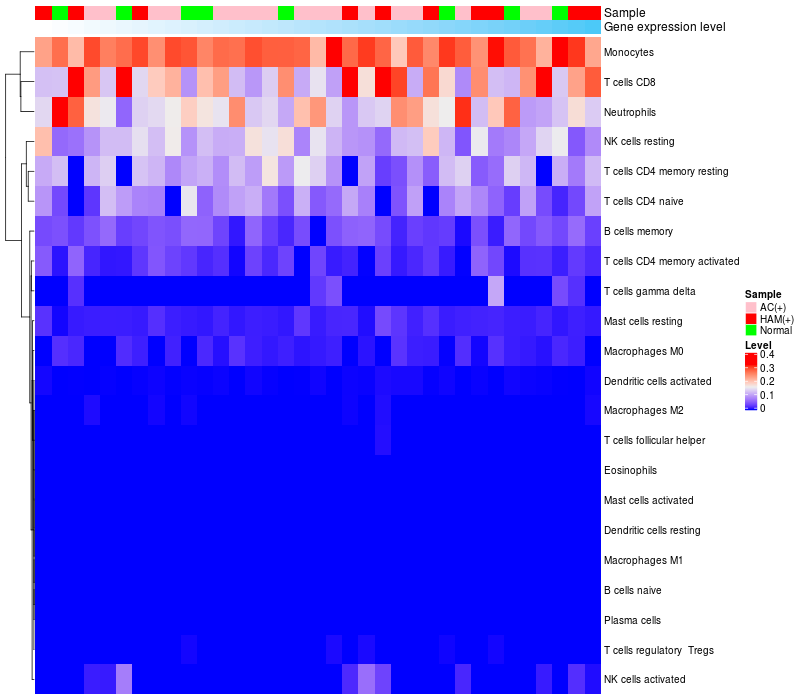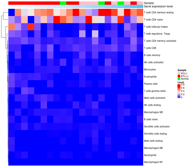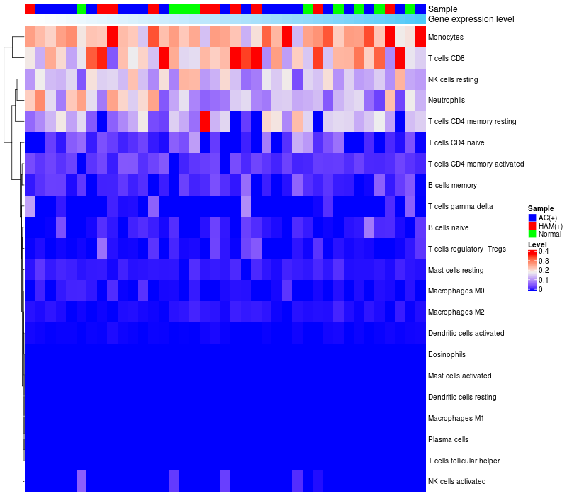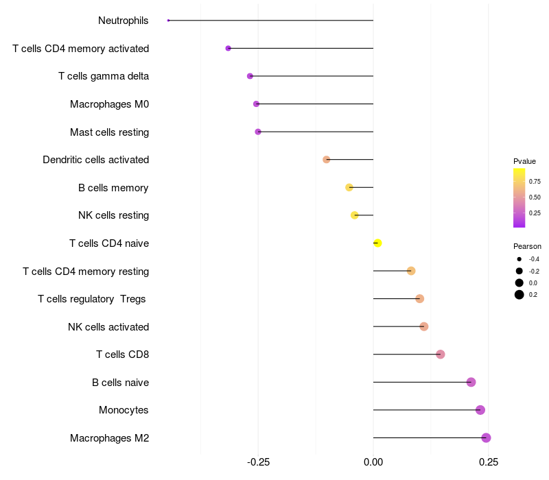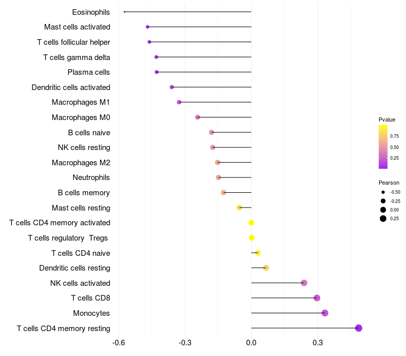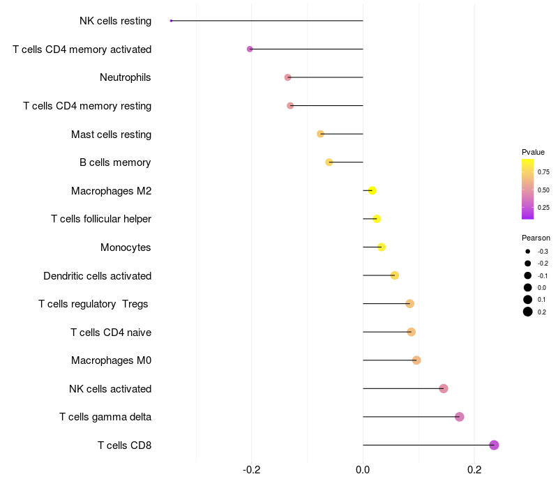 Lollipop of PGBD2 expression and immune infiltrating cell level correlation result in HTLV1+ samples