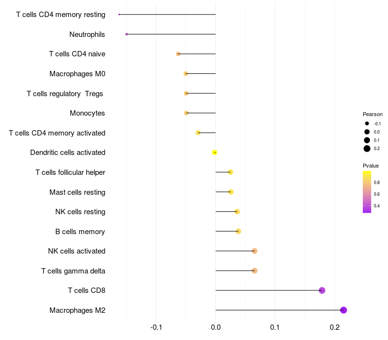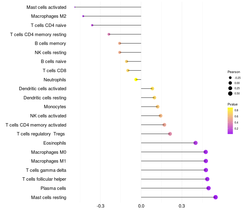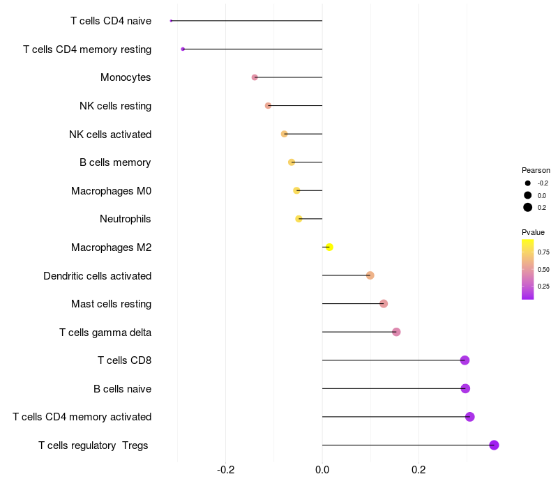 Lollipop of PGC expression and immune infiltrating cell level correlation result in HTLV1+ samples
