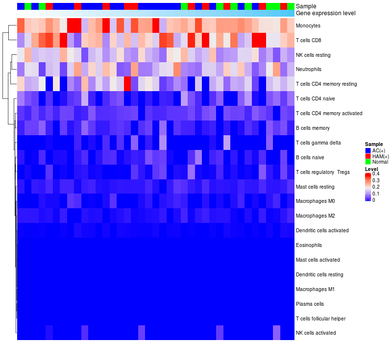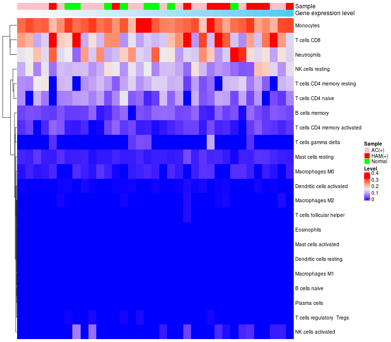 Normal (8), Asymptomatic carriers (HTLV1+)(17), HTLV-1-associated myelopathy (HTLV1+)(10) |