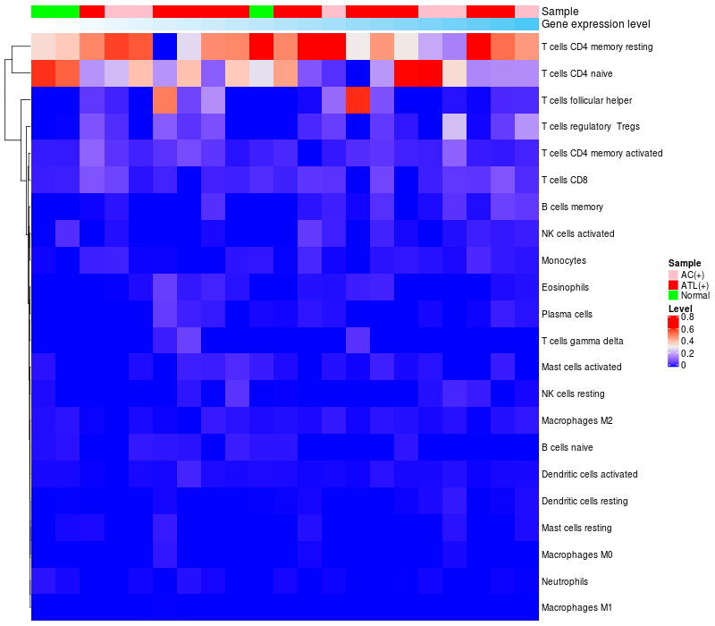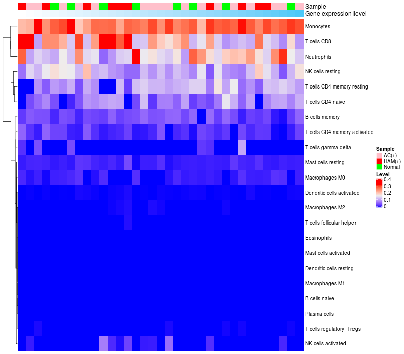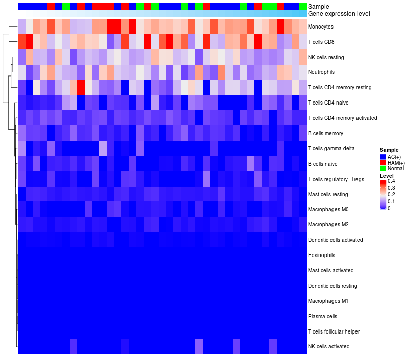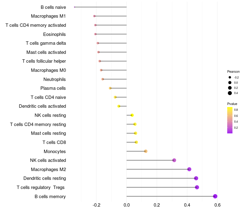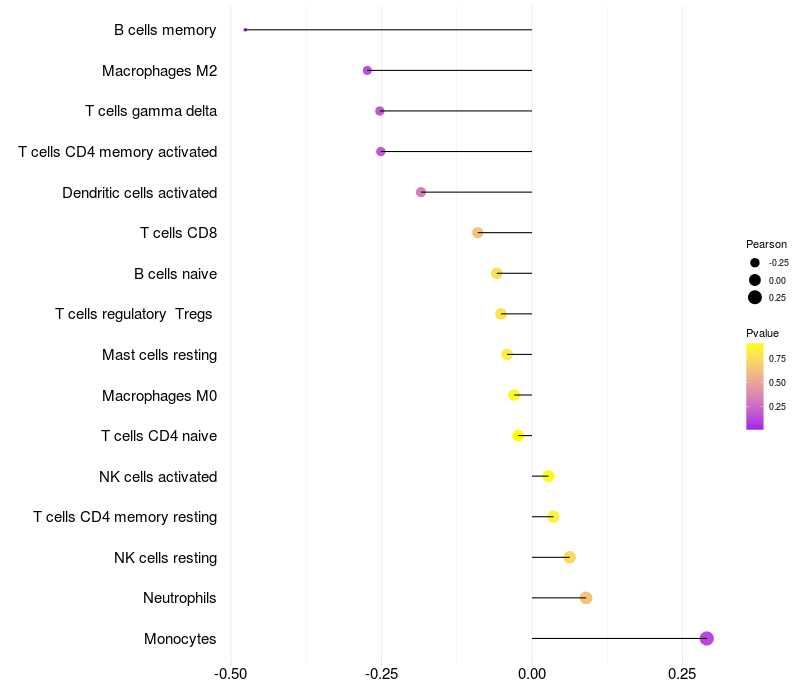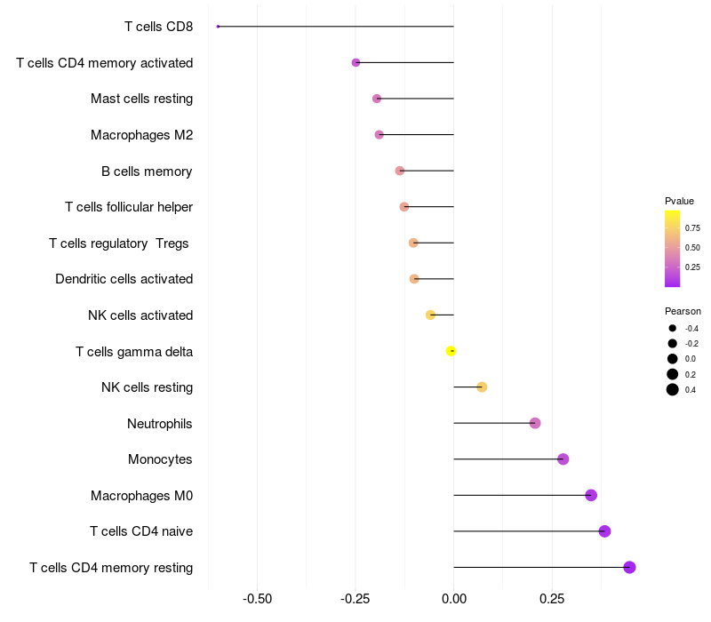 Lollipop of PGM5 expression and immune infiltrating cell level correlation result in HTLV1+ samples