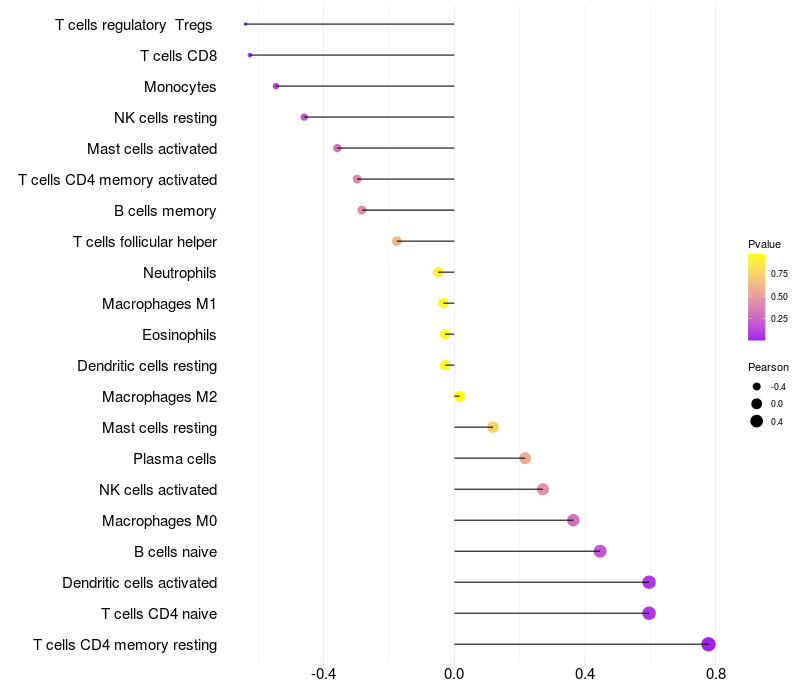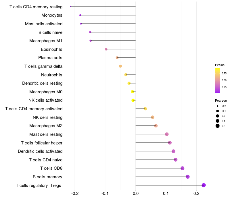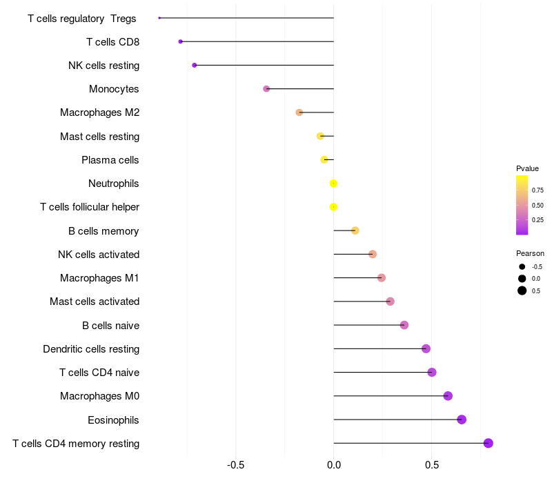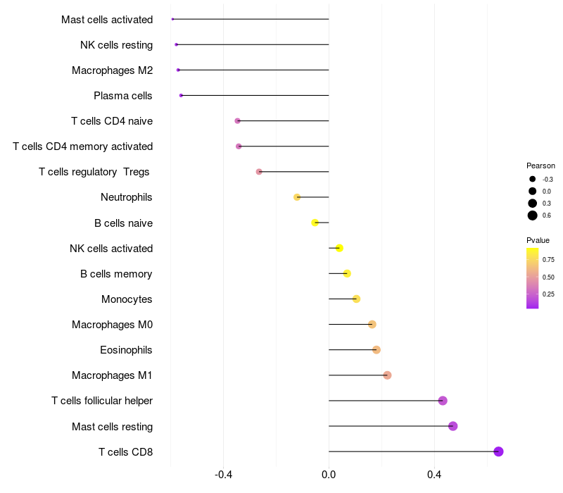 Lollipop of PGPEP1 expression and immune infiltrating cell level correlation result in HBV+ Liver cirrhosis samples