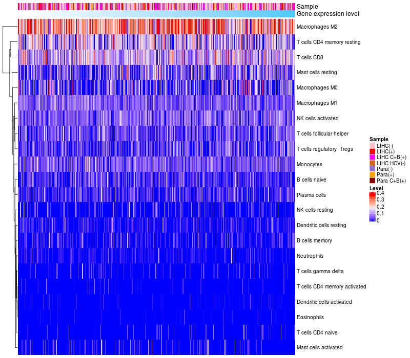 Liver hepatocellular carcinoma HCV (HBV+)(86), Liver hepatocellular carcinoma HCV (HBV-)(19), Liver hepatocellular carcinoma (HBV+)(209), Liver hepatocellular carcinoma (HBV+)(60), Paracancerous HCV (HBV+)(4), Paracancerous (HBV-)(28), Paracancerous (HBV+)(18) |