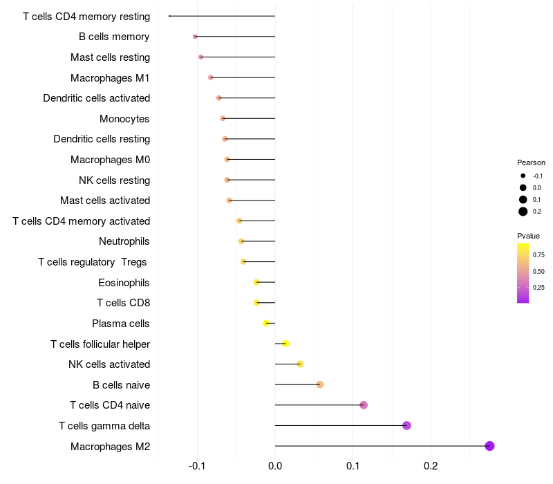 Lollipop of PGR expression and immune infiltrating cell level correlation result in HBV+ samples