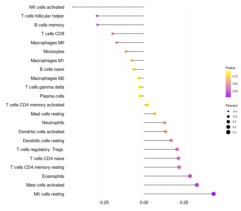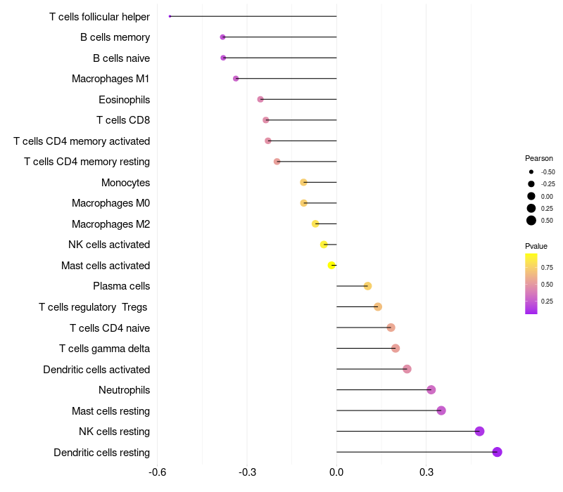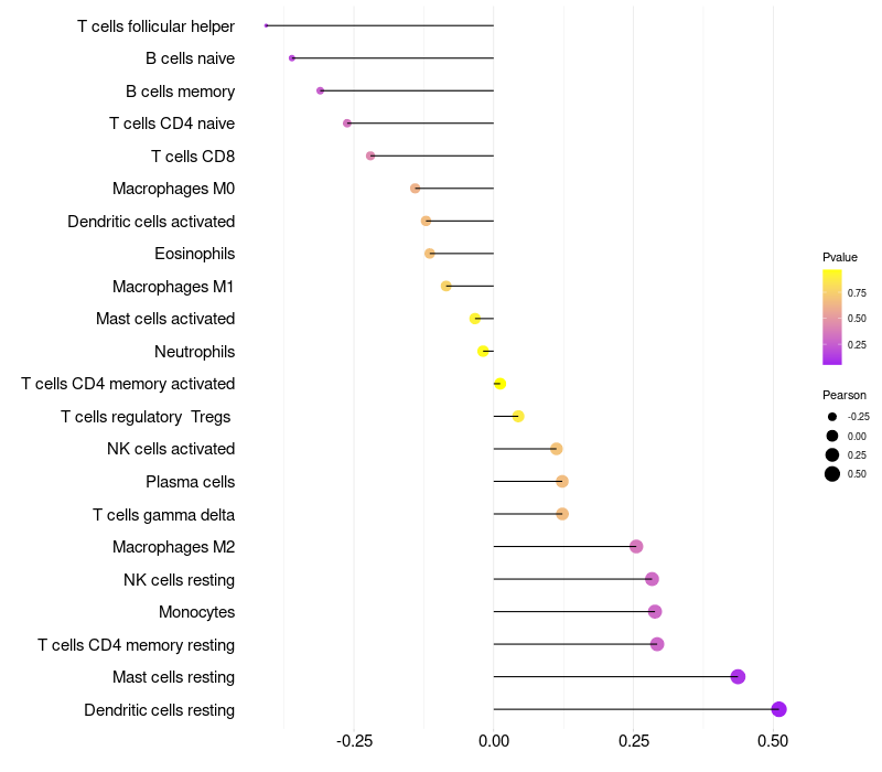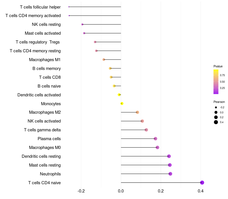 Lollipop of PGRMC2 expression and immune infiltrating cell level correlation result in HPV+ samples