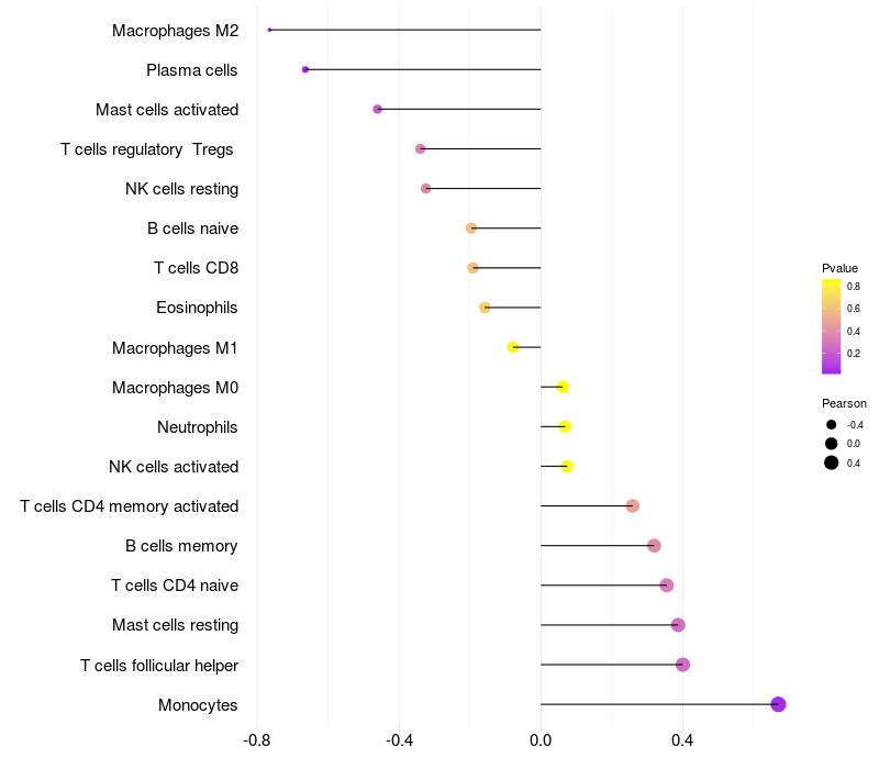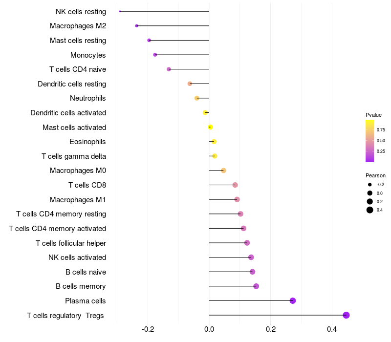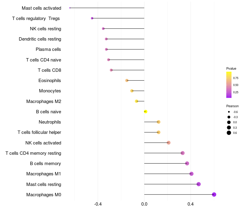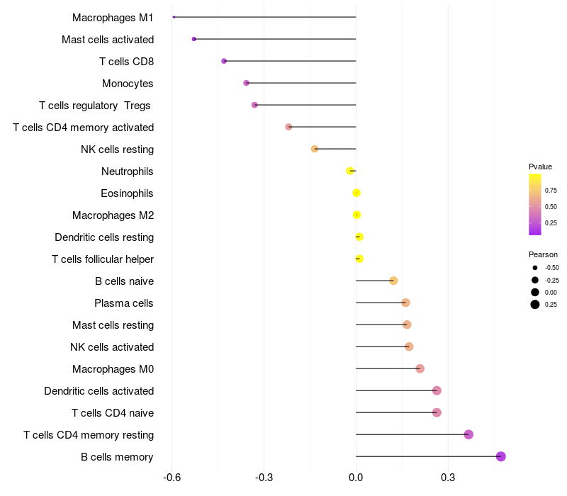 Lollipop of PHC1 expression and immune infiltrating cell level correlation result in HBV+ Liver cirrhosis samples