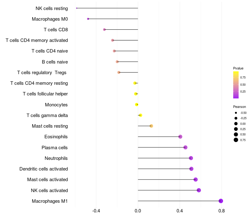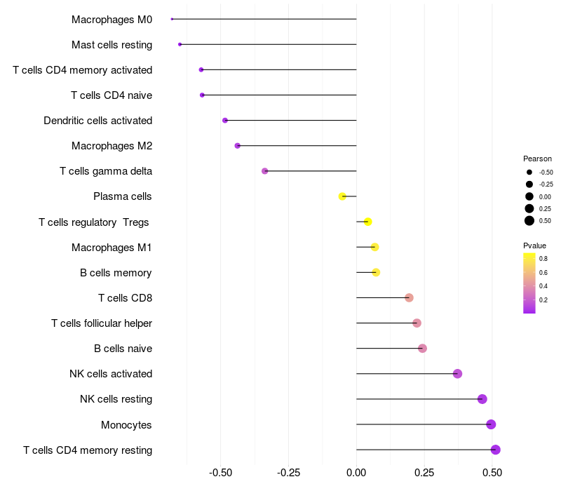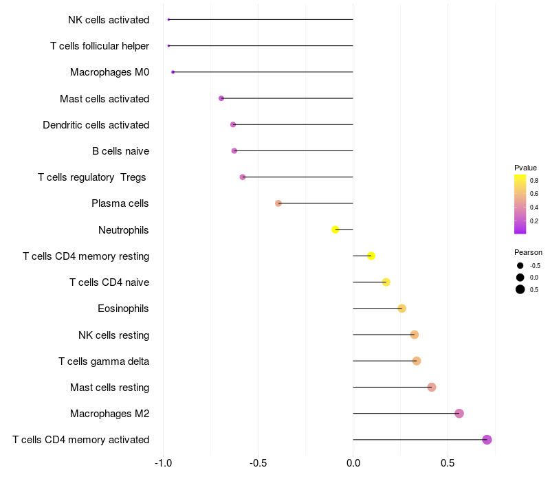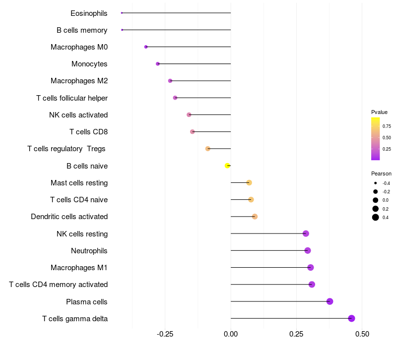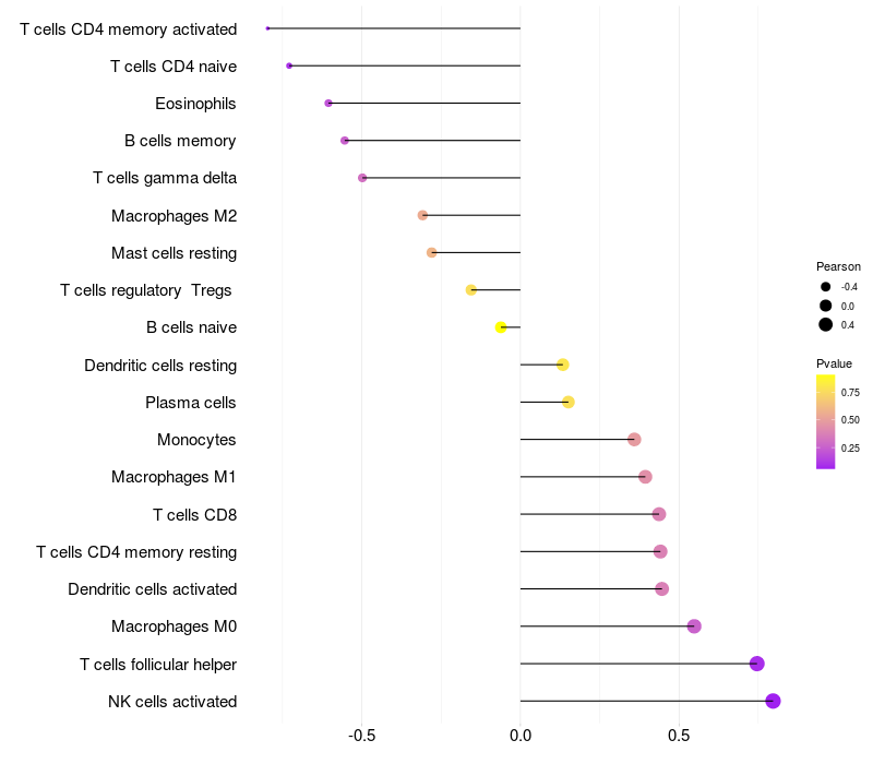 Lollipop of PHF11 expression and immune infiltrating cell level correlation result in EBV+ samples