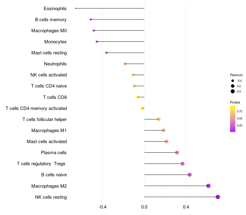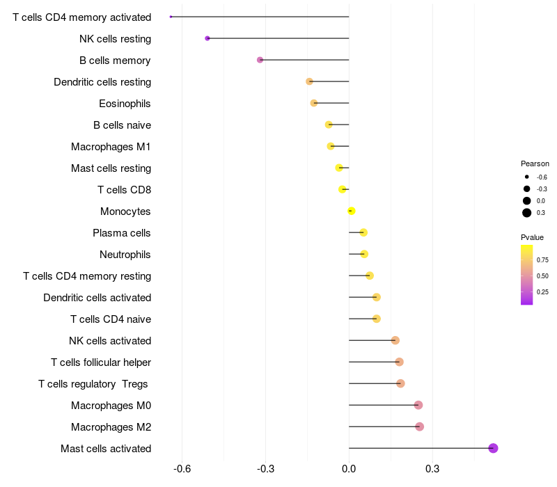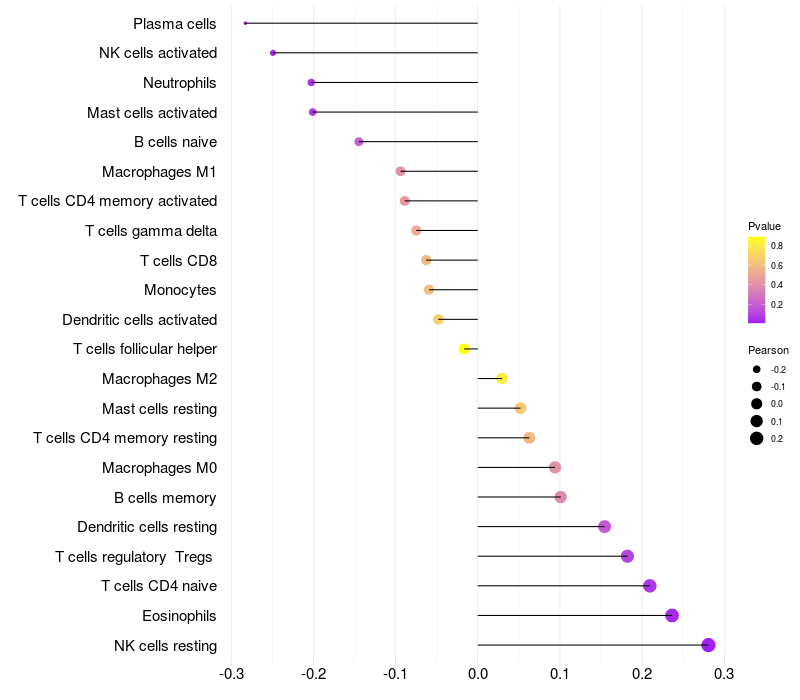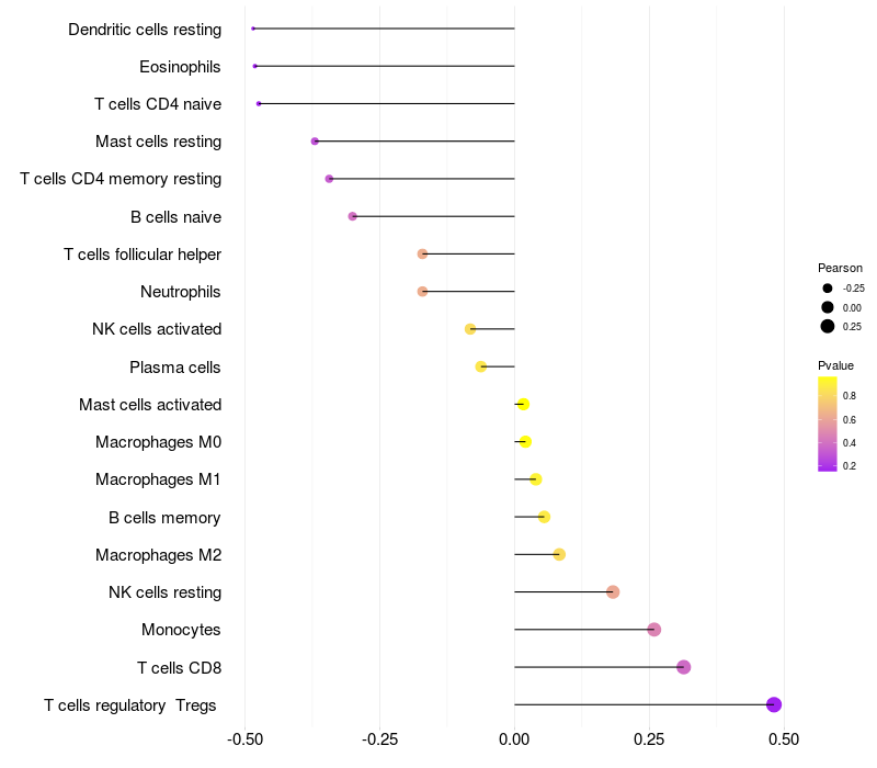Lollipop of PHF14 expression and immune infiltrating cell level correlation result in HBV+ Chronic HBV (CHB) infection samples