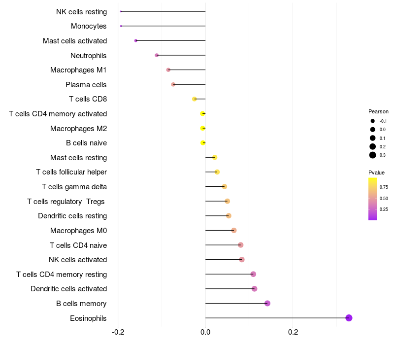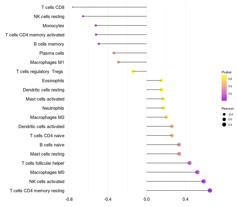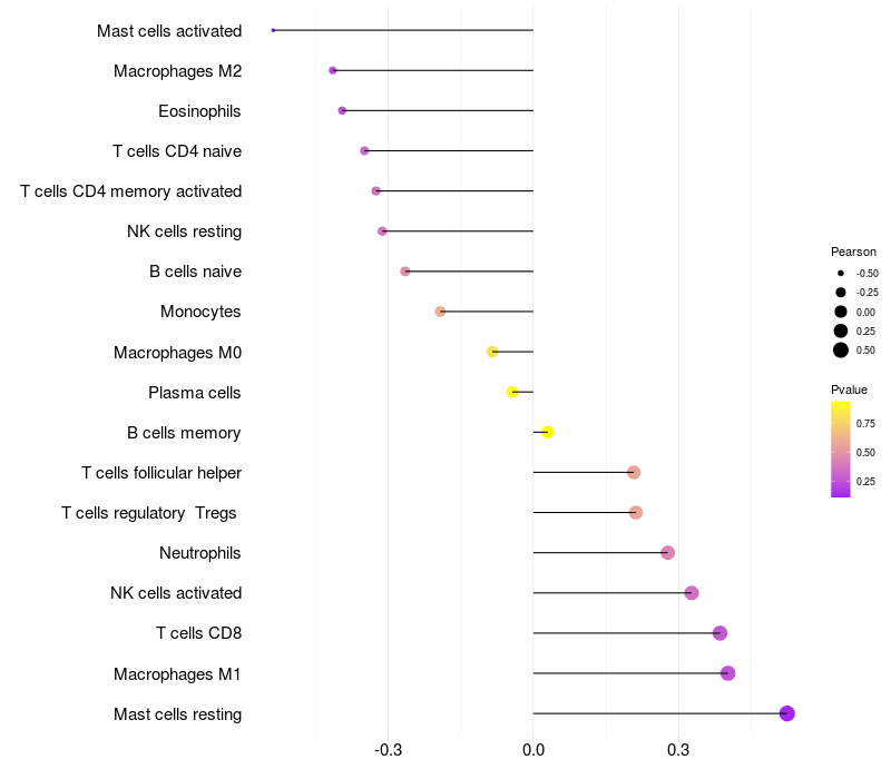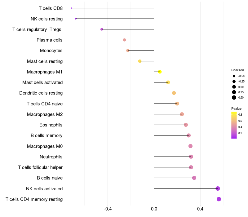 Lollipop of PHF20 expression and immune infiltrating cell level correlation result in HBV+ Chronic HBV (CHB) infection samples