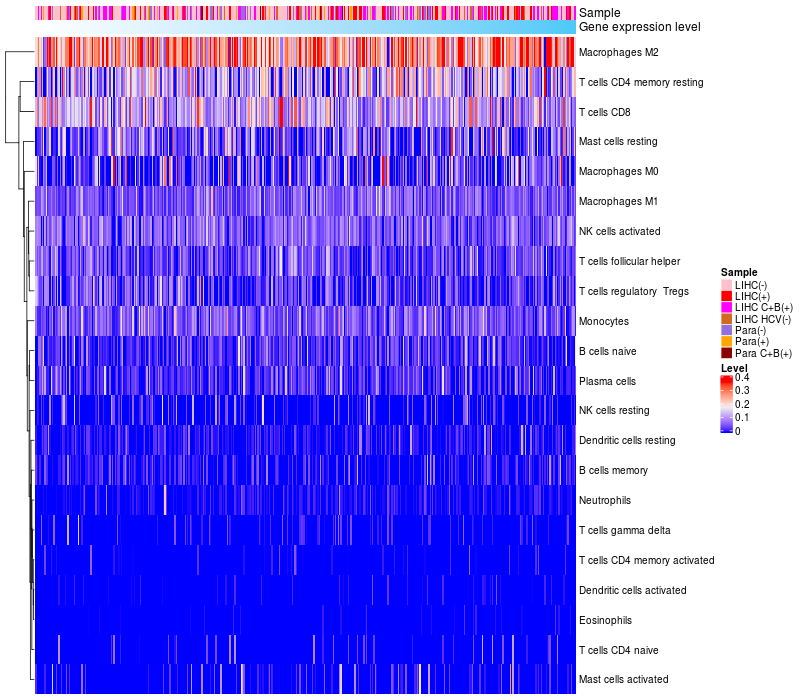 Liver hepatocellular carcinoma HCV (HBV+)(86), Liver hepatocellular carcinoma HCV (HBV-)(19), Liver hepatocellular carcinoma (HBV+)(209), Liver hepatocellular carcinoma (HBV+)(60), Paracancerous HCV (HBV+)(4), Paracancerous (HBV-)(28), Paracancerous (HBV+)(18) |