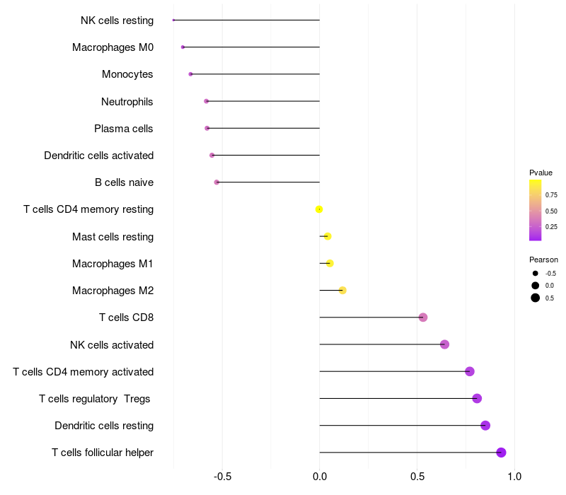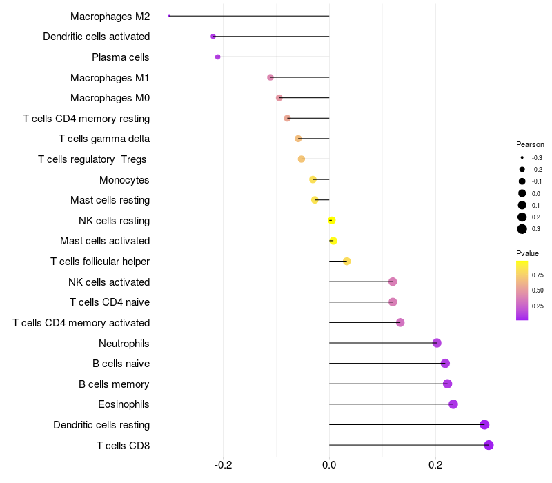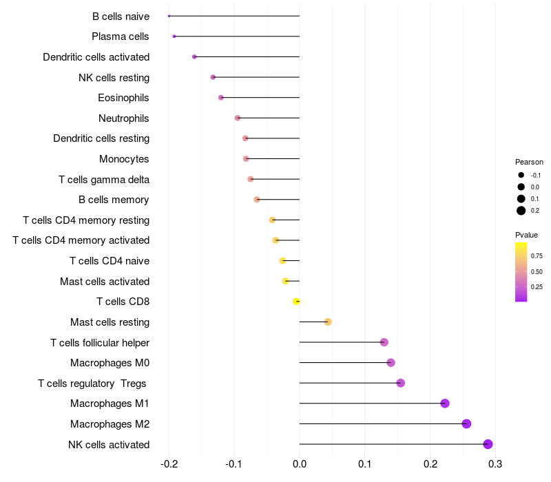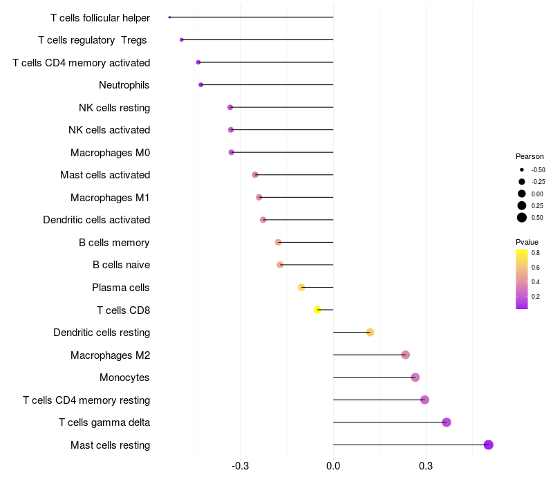 Lollipop of PHF21B expression and immune infiltrating cell level correlation result in HPV+ samples