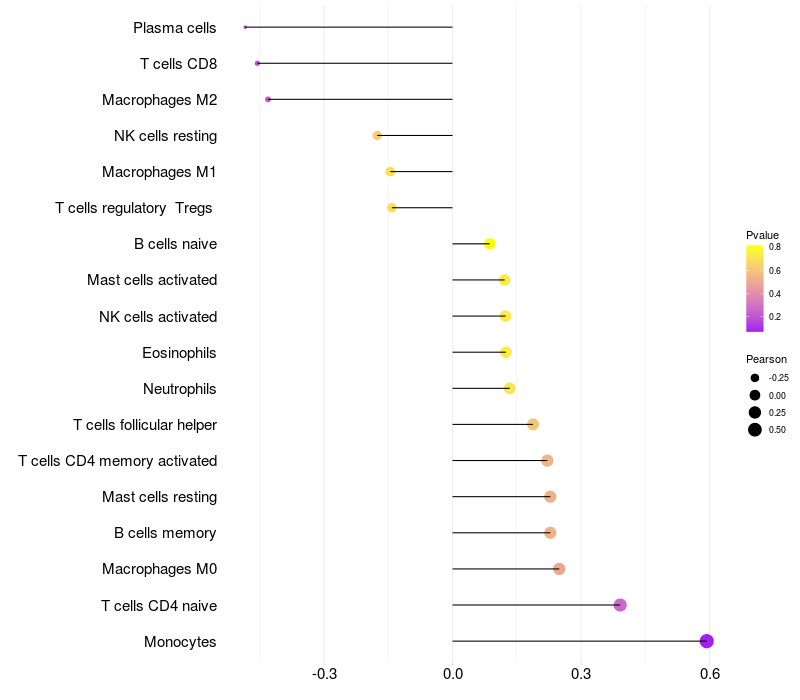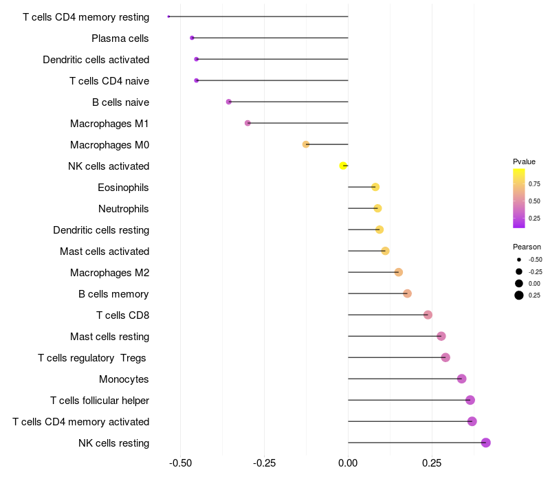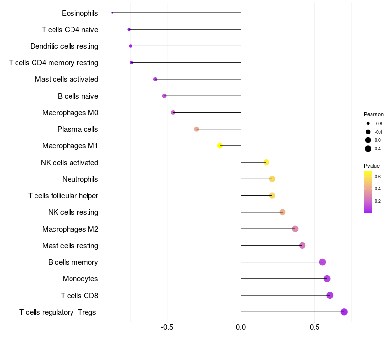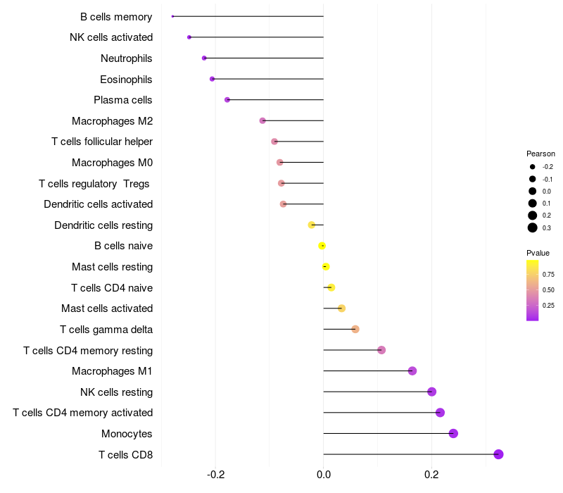 Lollipop of PHF7 expression and immune infiltrating cell level correlation result in HBV+ Liver cirrhosis samples