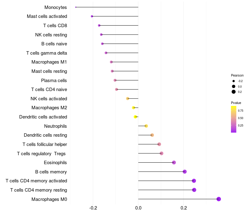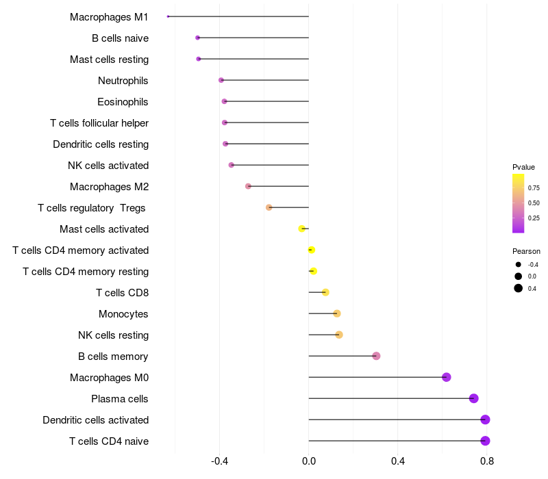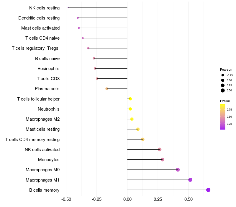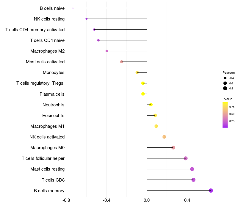 Lollipop of PHTF2 expression and immune infiltrating cell level correlation result in HBV+ Liver cirrhosis samples