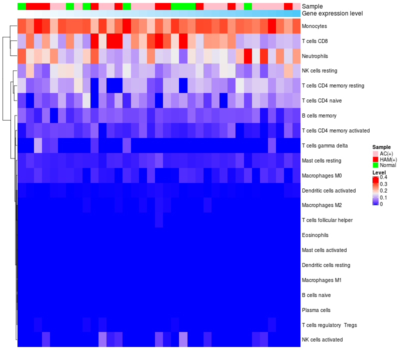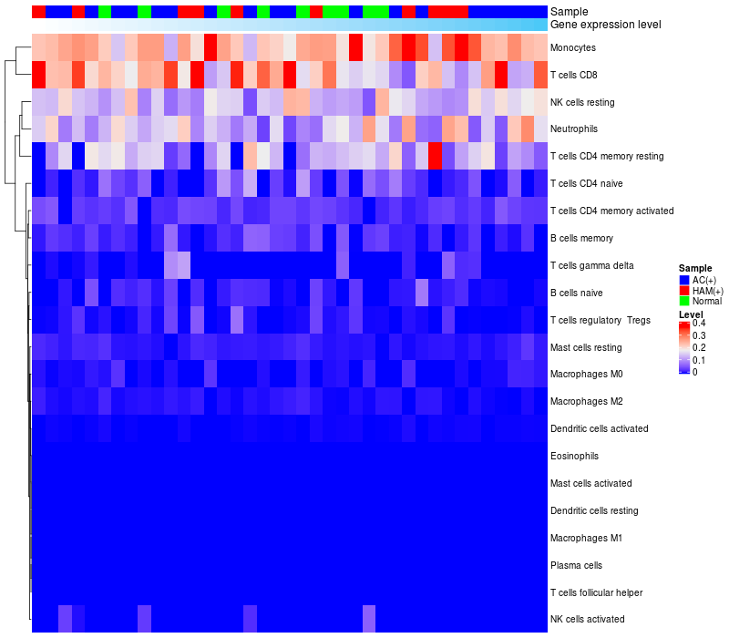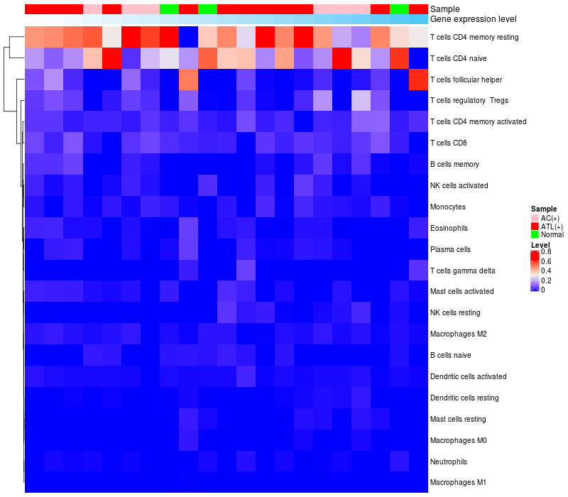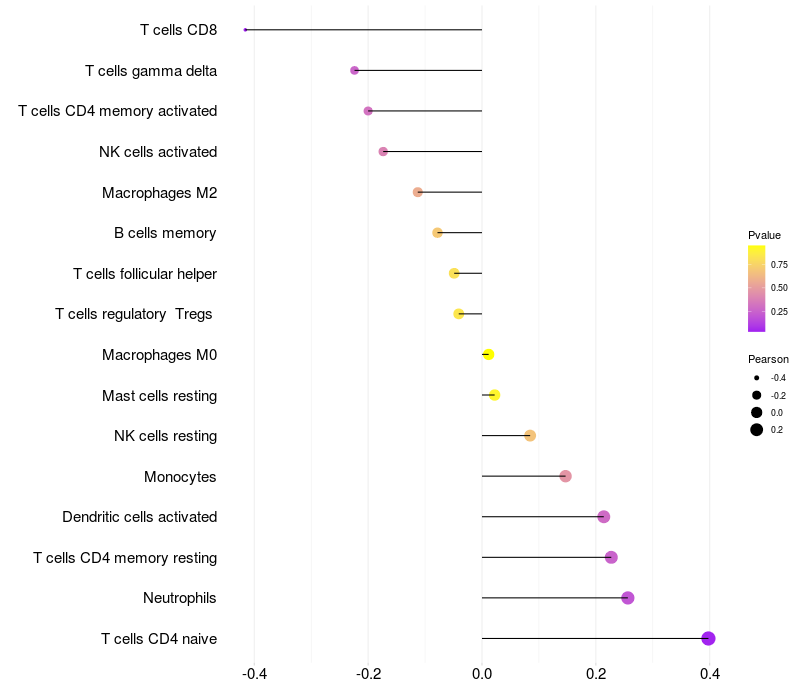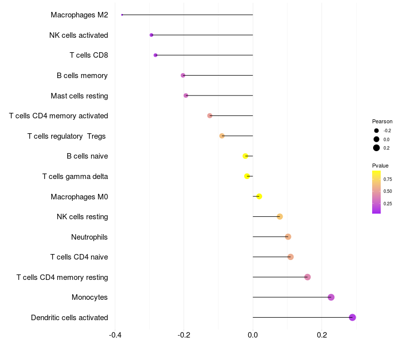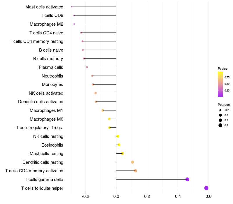 Lollipop of PHYHD1 expression and immune infiltrating cell level correlation result in HTLV1+ samples