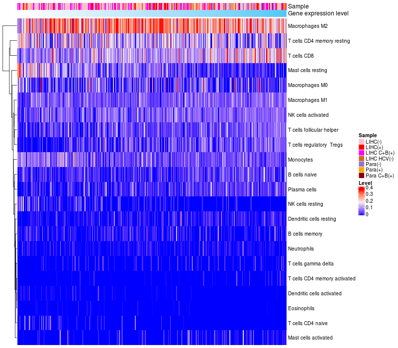 Liver hepatocellular carcinoma HCV (HBV+)(86), Liver hepatocellular carcinoma HCV (HBV-)(19), Liver hepatocellular carcinoma (HBV+)(209), Liver hepatocellular carcinoma (HBV+)(60), Paracancerous HCV (HBV+)(4), Paracancerous (HBV-)(28), Paracancerous (HBV+)(18) |