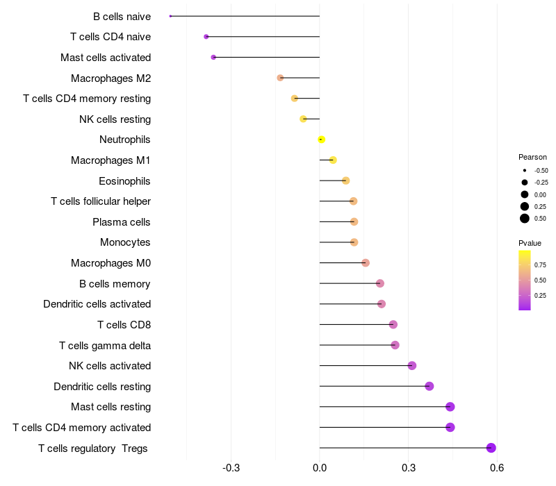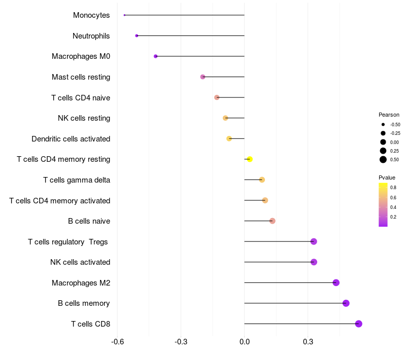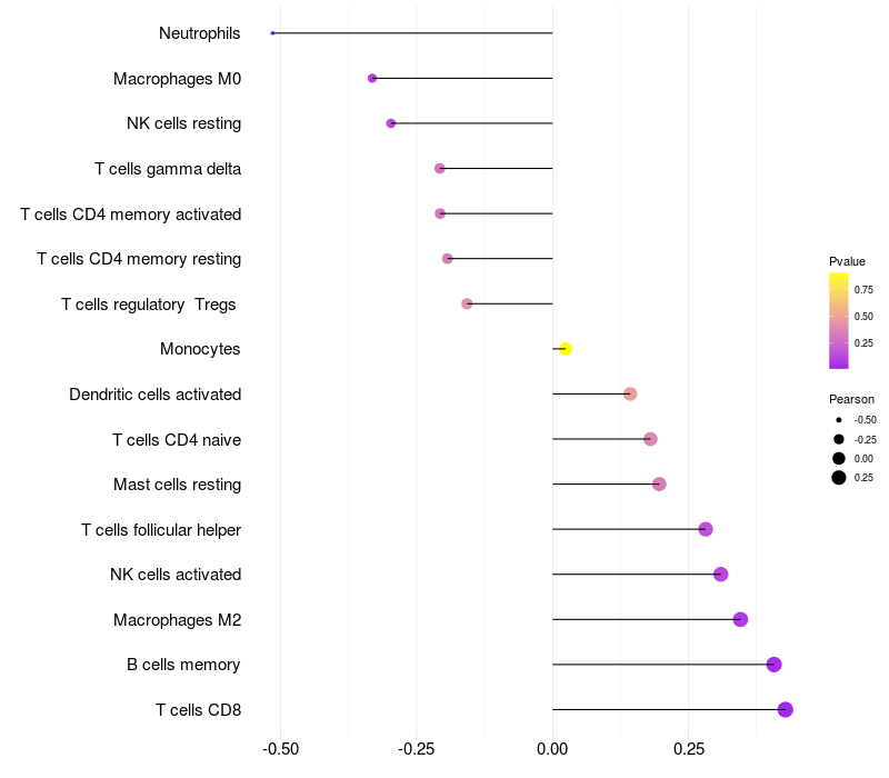 Lollipop of PITPNB expression and immune infiltrating cell level correlation result in HTLV1+ samples