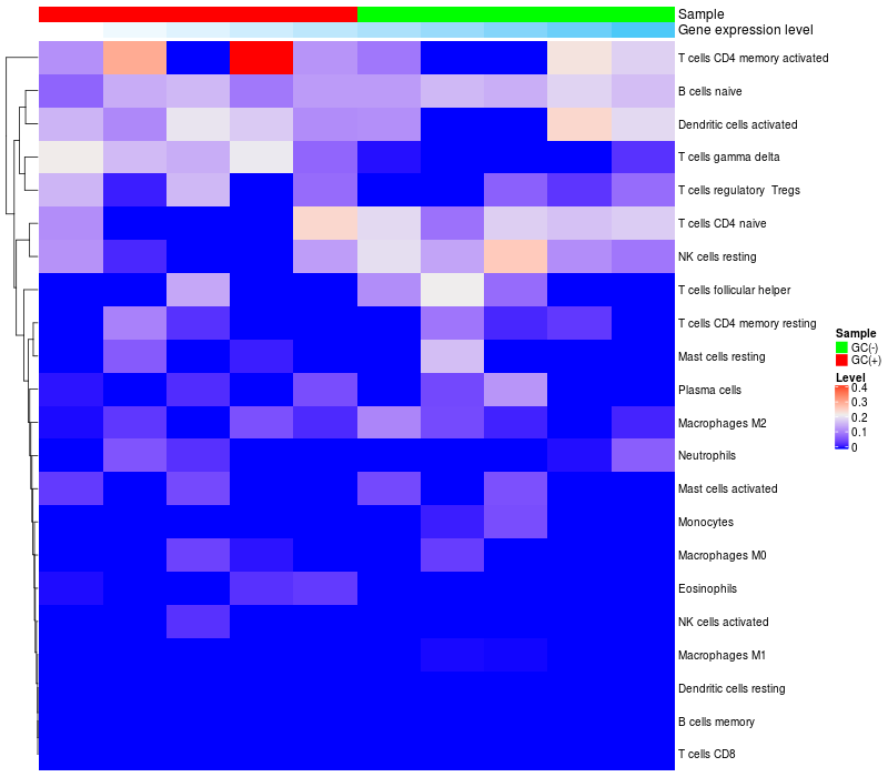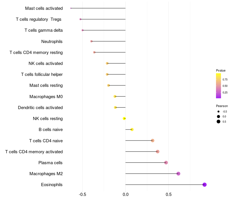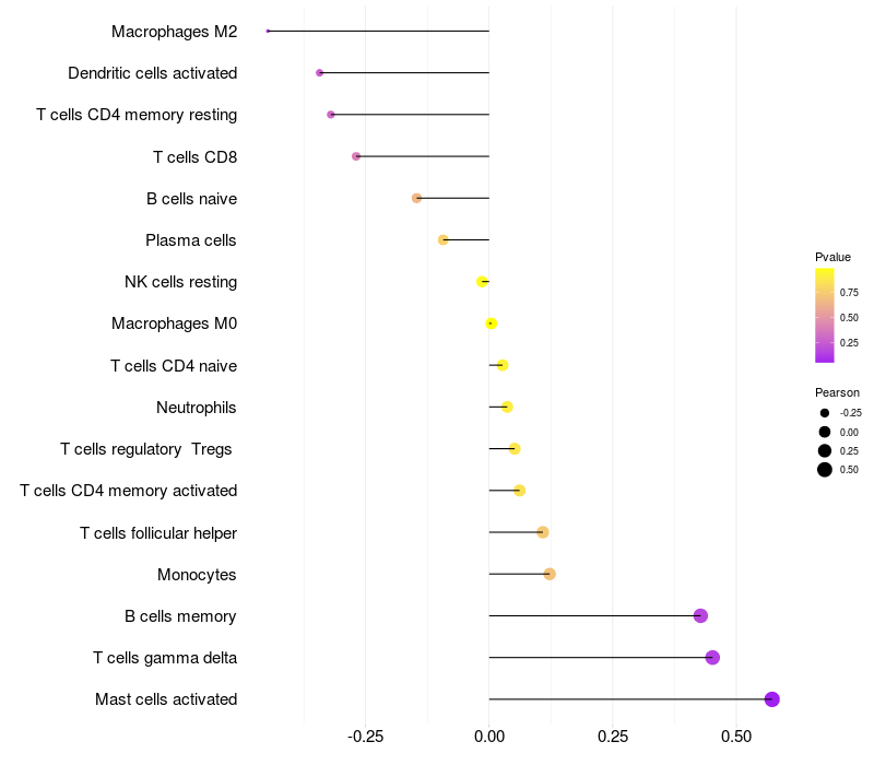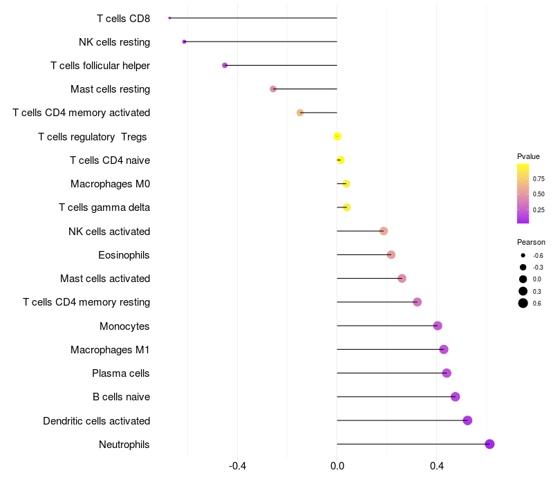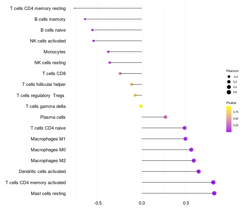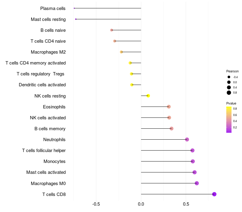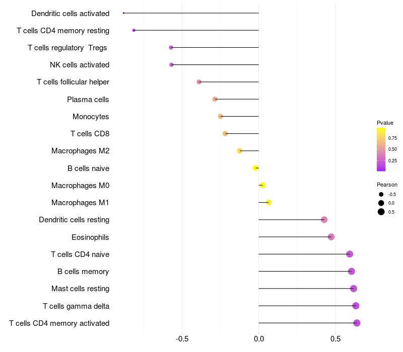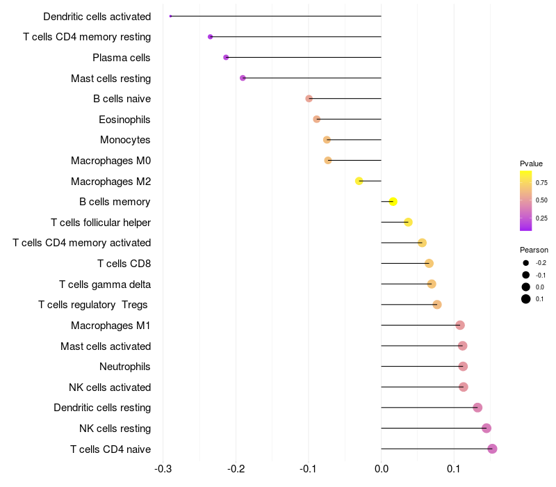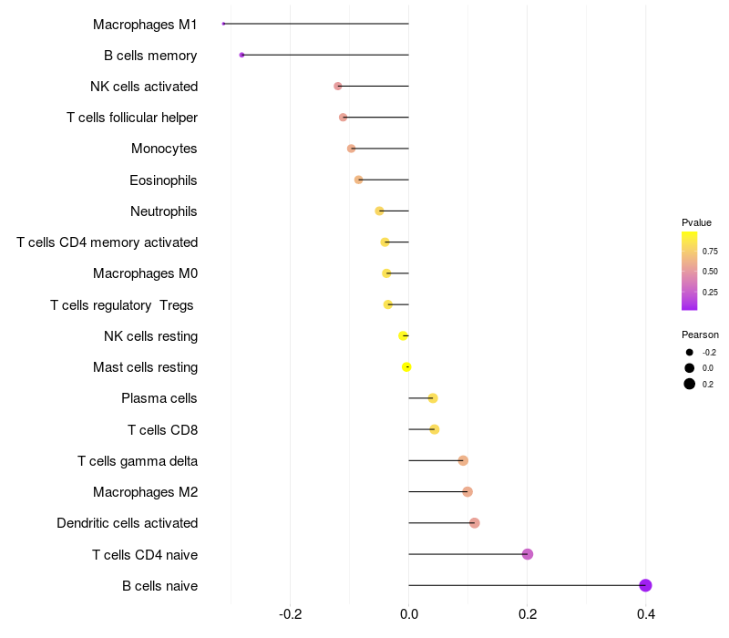Lollipop of PIWIL2 expression and immune infiltrating cell level correlation result in EBV+ samples
