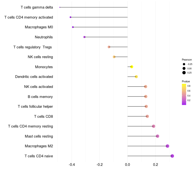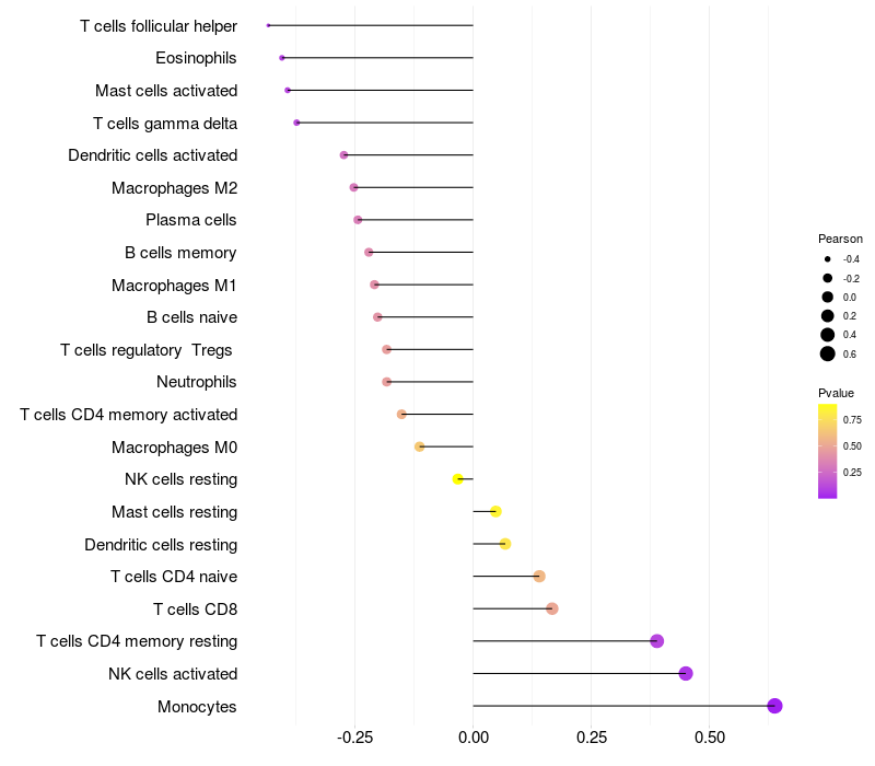 Lollipop of PKD1 expression and immune infiltrating cell level correlation result in HTLV1+ samples