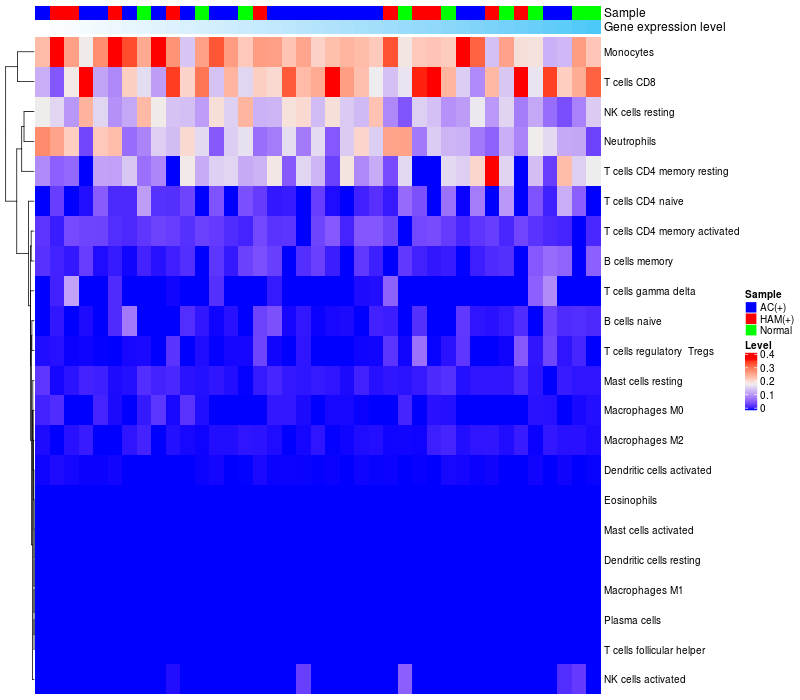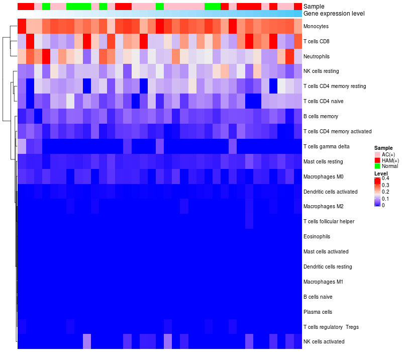 Normal (8), Asymptomatic carriers (HTLV1+)(17), HTLV-1-associated myelopathy (HTLV1+)(10) |