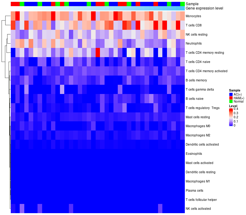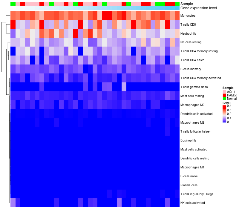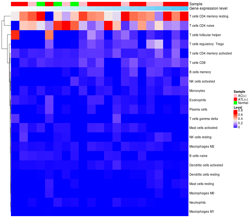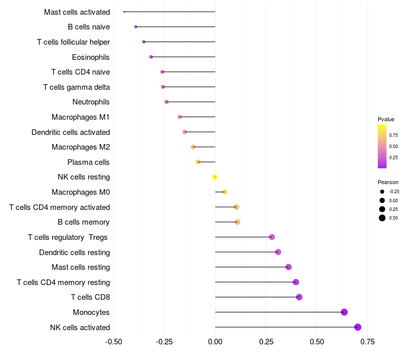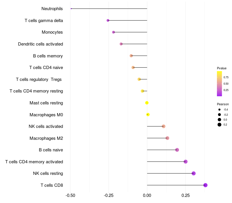 Lollipop of PKN3 expression and immune infiltrating cell level correlation result in HTLV1+ samples