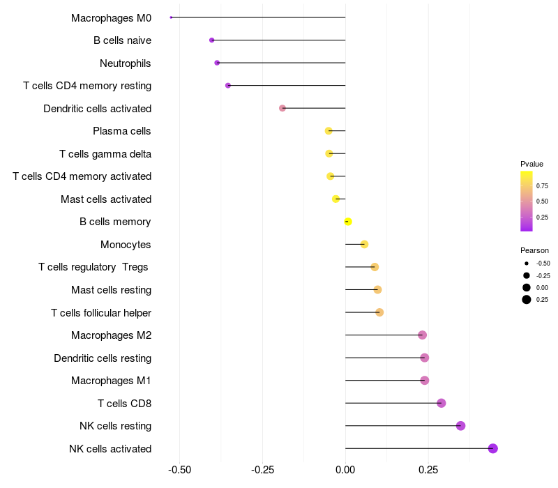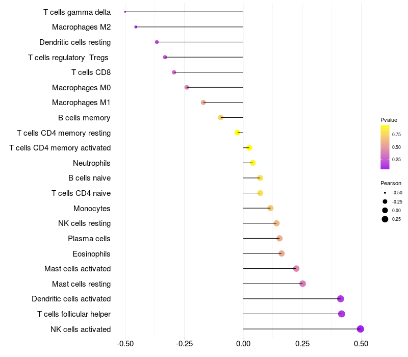 Lollipop of PLA2G2E expression and immune infiltrating cell level correlation result in HPV+ samples