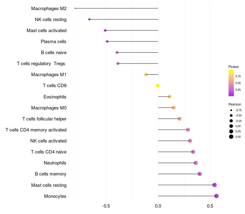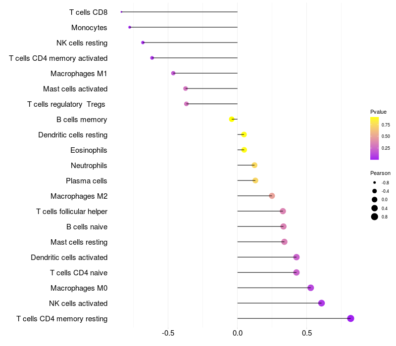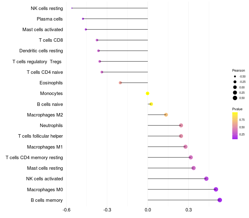 Lollipop of PLAGL1 expression and immune infiltrating cell level correlation result in HBV+ Liver cirrhosis samples